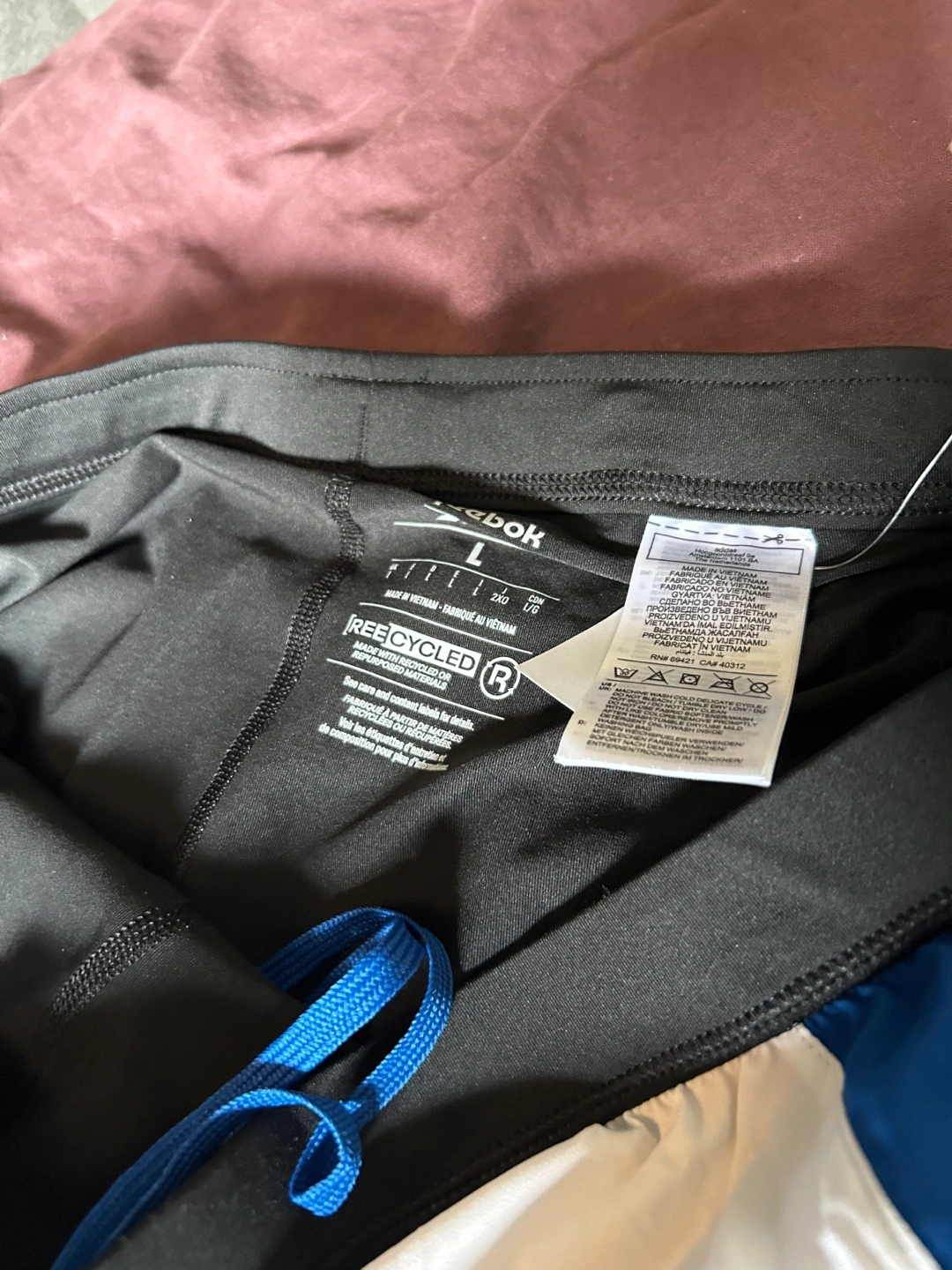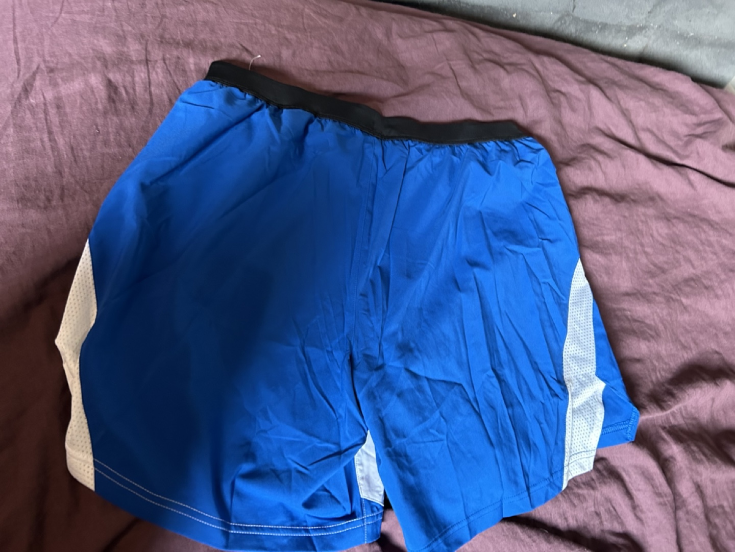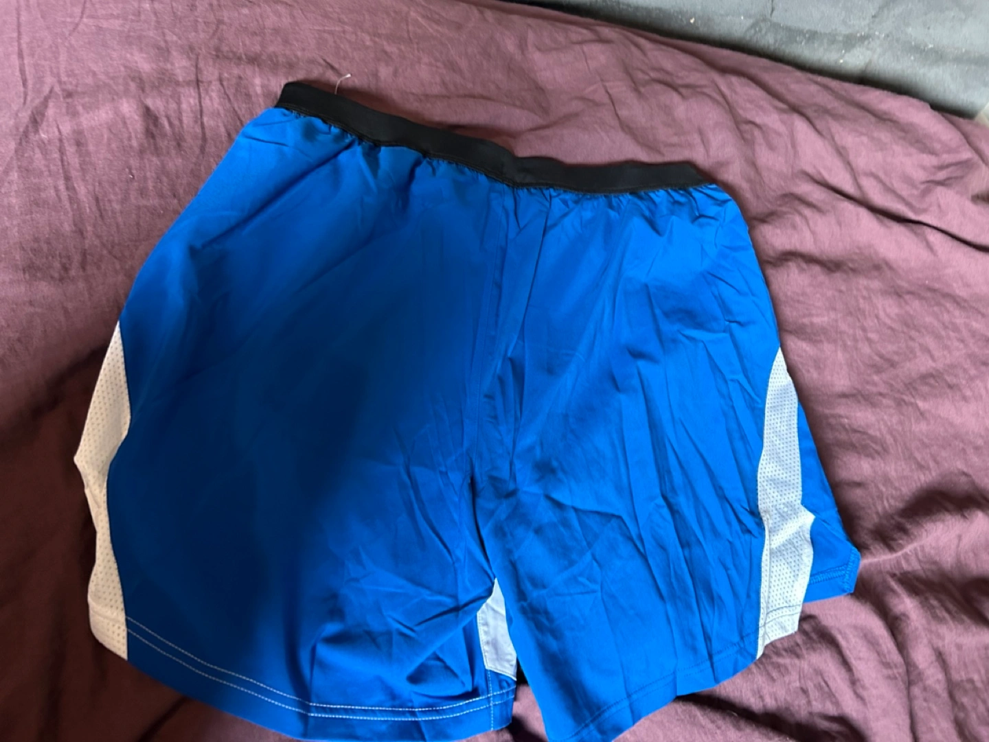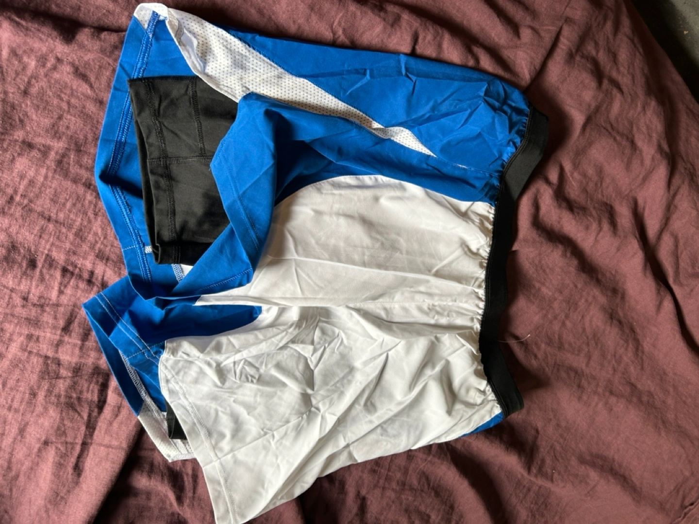 Men's running shorts. Blue, white, and black colour block design. Elastic waistband. Mesh side panels. Recycled materials. Size large. New with tags.