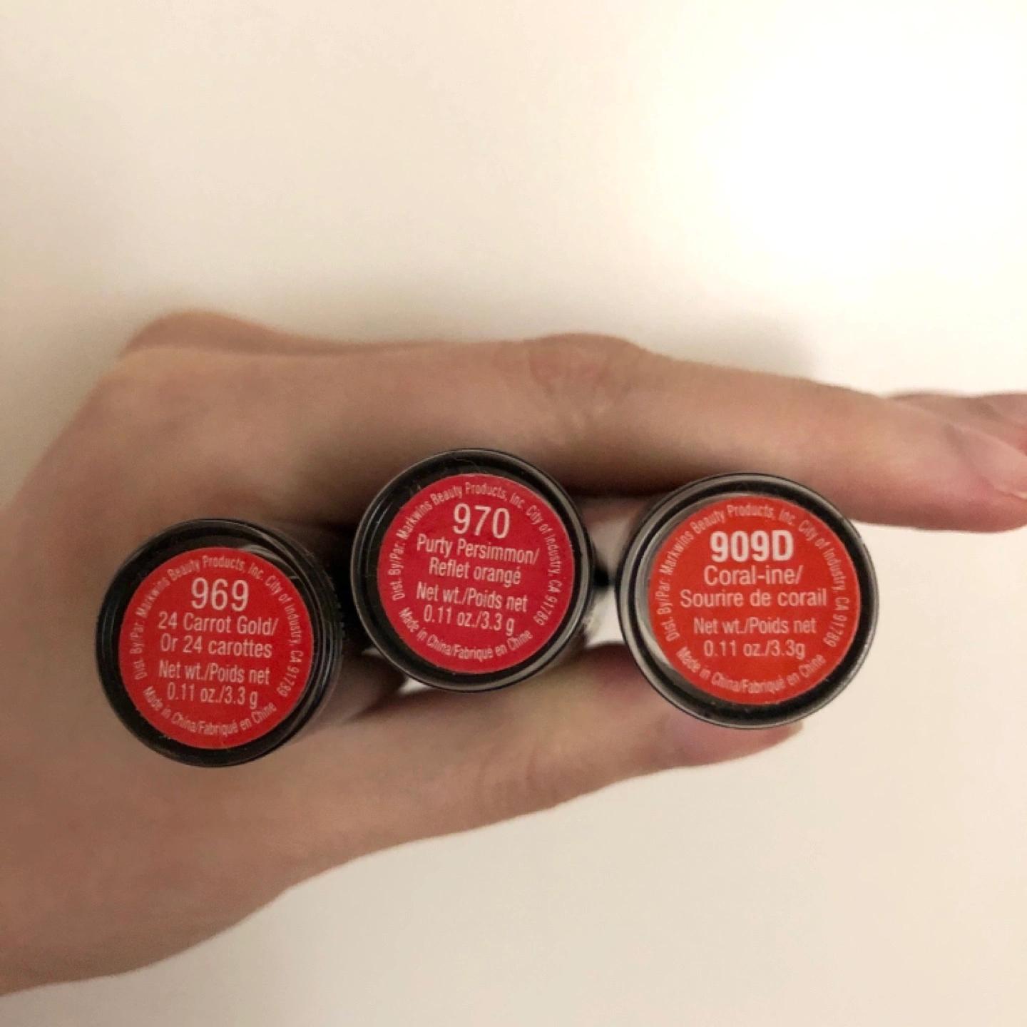 - Shades include 969 24 Carot Gold, 970 Purity Persimmon, and 909D Coral-ine.