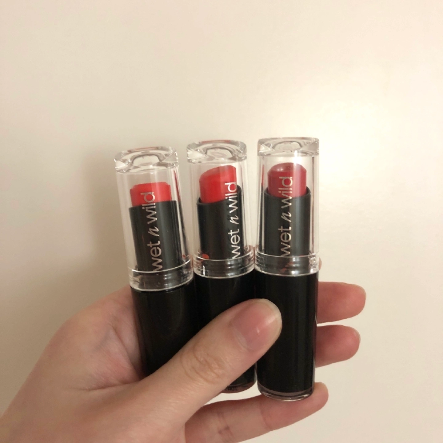 Three Wet n Wild lipsticks.