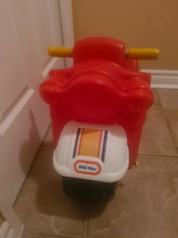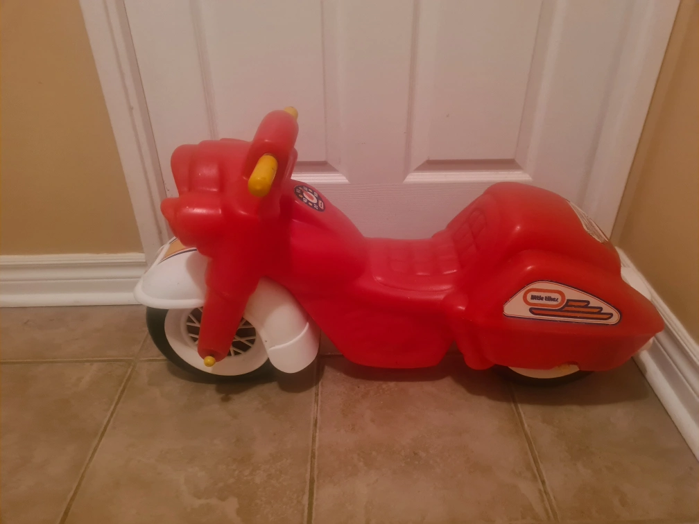 Red plastic children's motorcycle. Features two large wheels and a simple design. Used good condition.