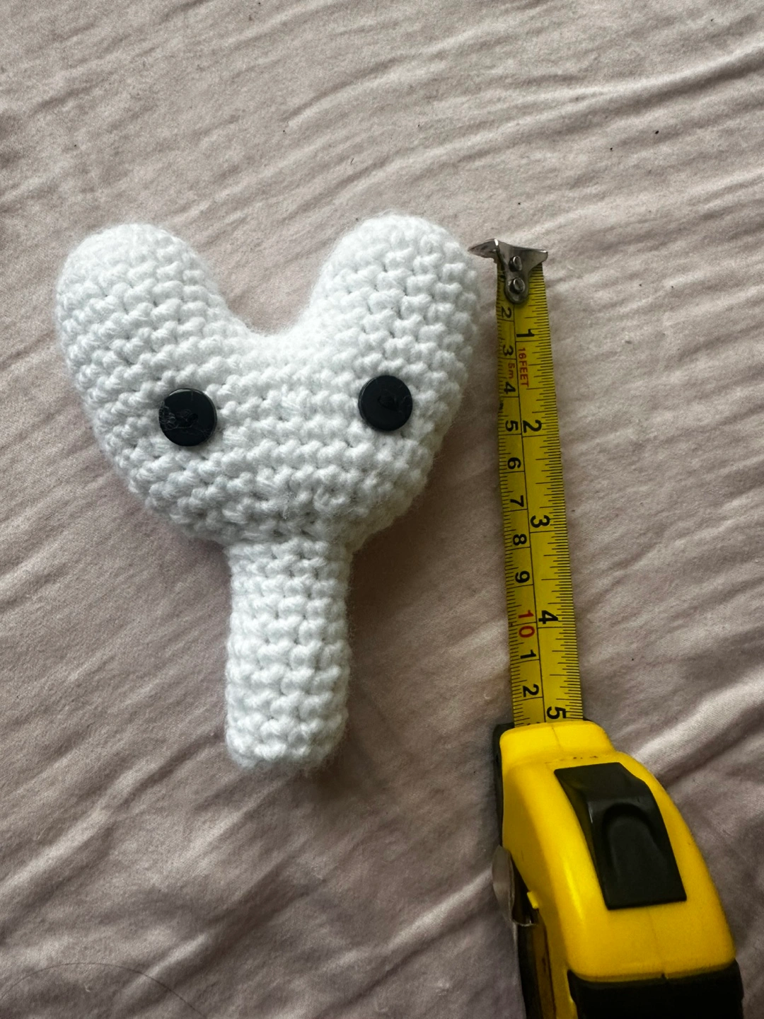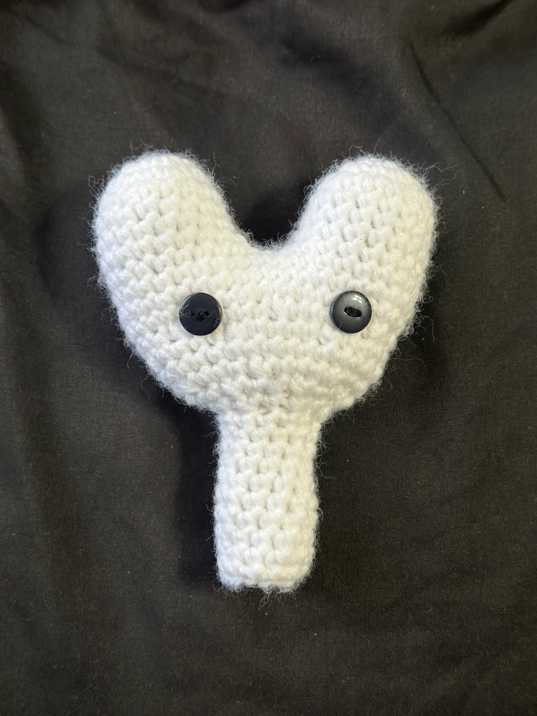 Adorable crocheted plush toy. White yarn, black button eyes. Approximately 5 inches tall. Unique and quirky design. Perfect gift or addition to any collection. This item will be made when it’s ordered. So please allow us a few days for it to get done.
