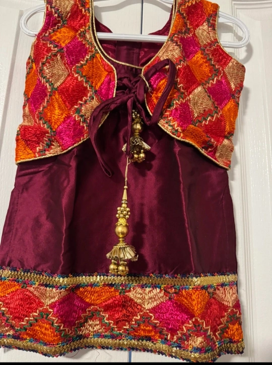 Beautiful maroon kids Punjabi suit. Features colourful embroidery on the jacket and bottom. Includes a matching bottom. Great for special occasions.
