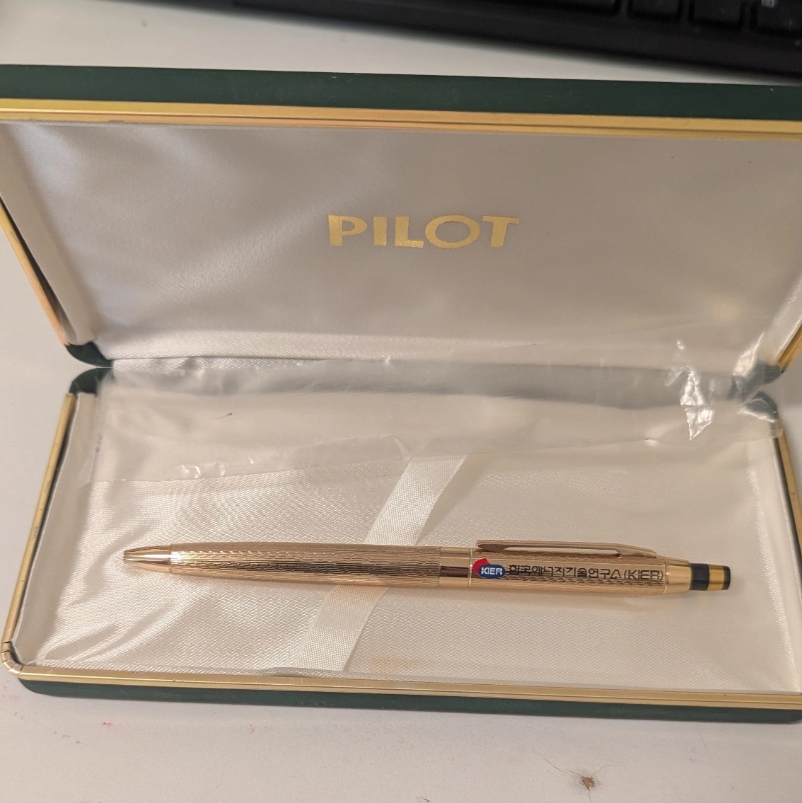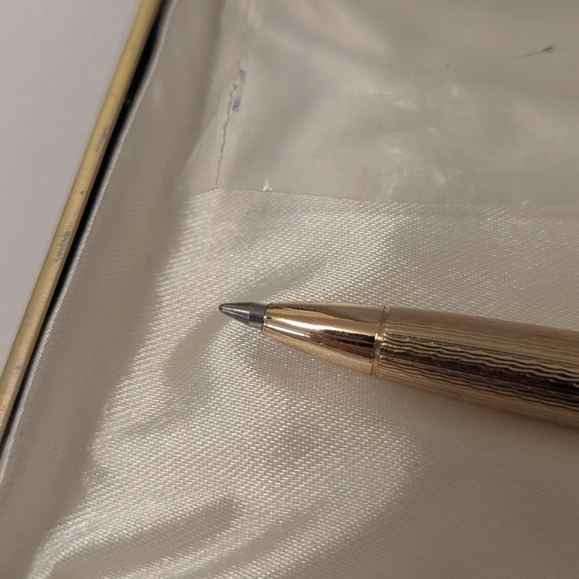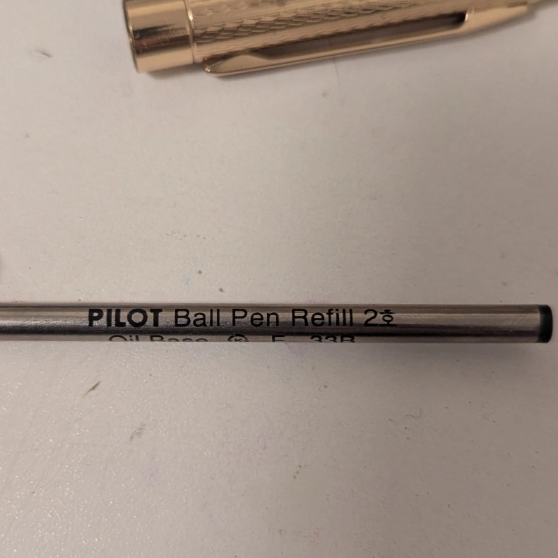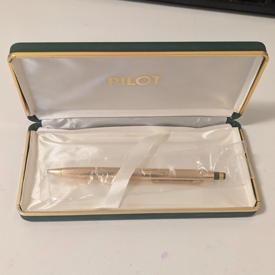 Gold-tone ballpoint pen. Comes in a green Pilot box. Refills are Pilot brand and it probably needs one cause it's vintage. New, not used.