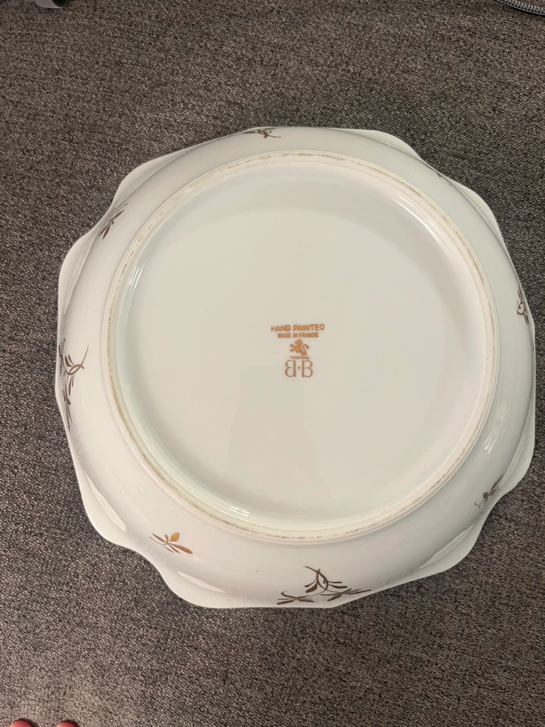 Beautiful vintage porcelain bowl. Birks BB hand painted in France. Features a gold coloured scalloped edge and floral pattern. Some scratches in the gold as shown. 10” wide.