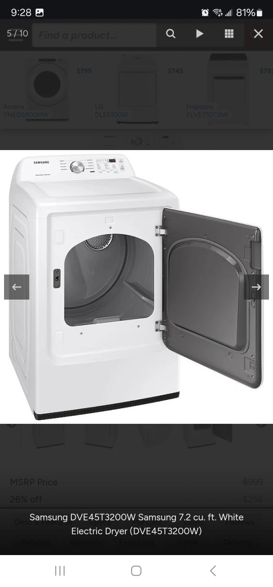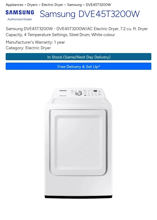7.2 cu. ft. capacity. 4 temperature settings. Steel drum. White colour. Pick up and cash only.