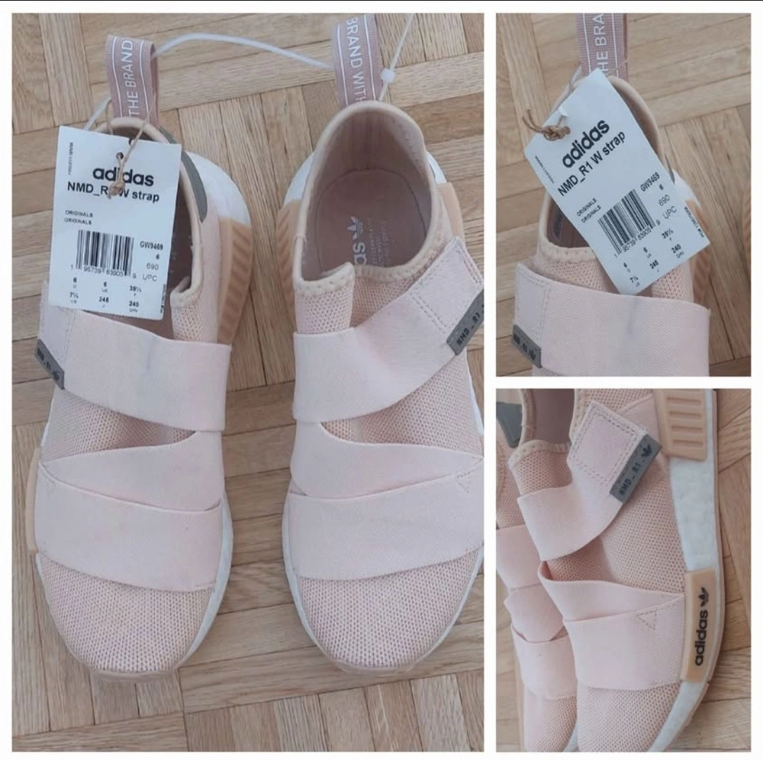 Pink Adidas NMD_R1 W strap sneakers. Slip-on style with three straps across the top. Size 7 or 39.