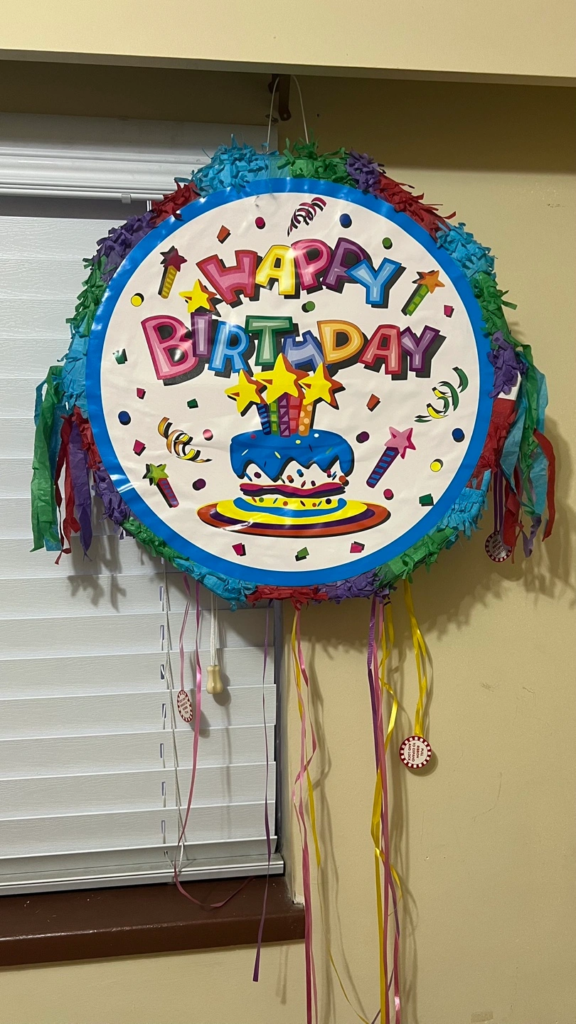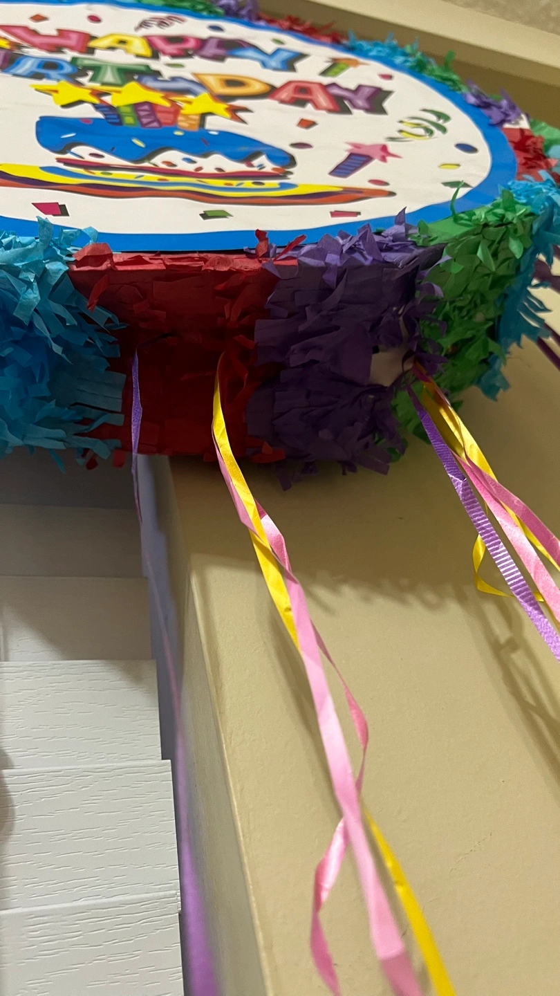 Large colourful round piñata. Features a birthday cake design. Ready for a party! Multiple coloured streamers.