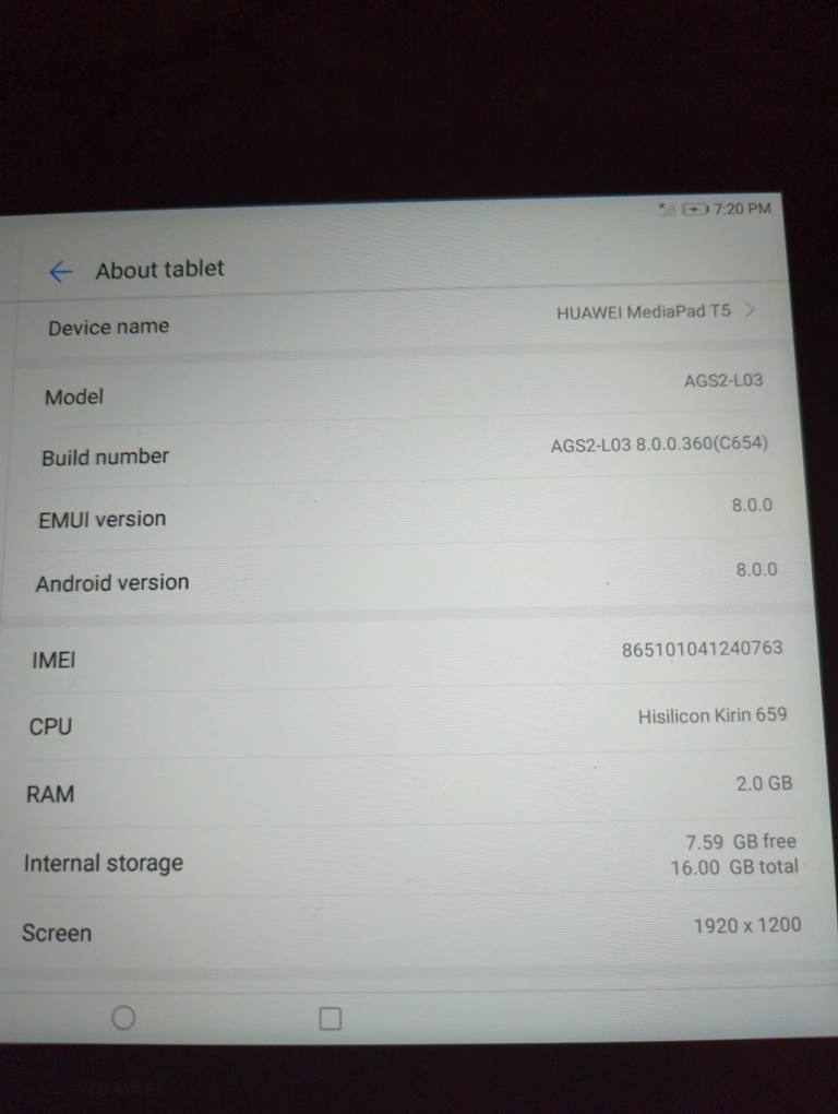 Used Huawei MediaPad T5 tablet. Features 2GB RAM and 16GB internal storage. Model AGS2-L03. Android 8.0.0. Screen resolution 1920 x 1200.