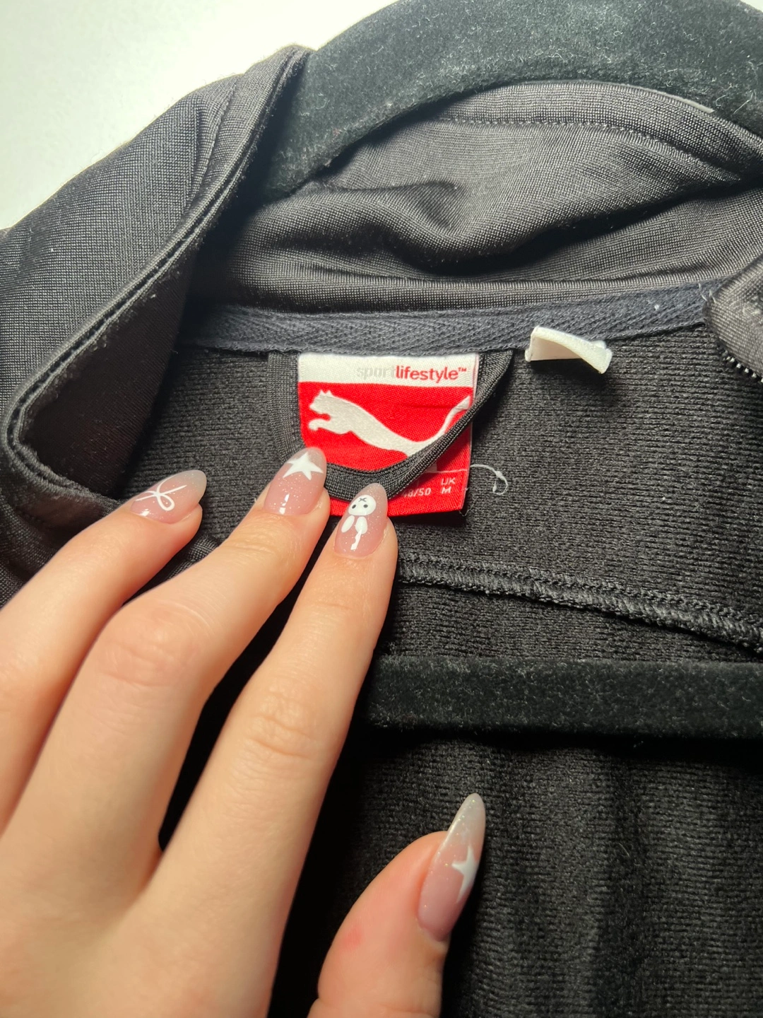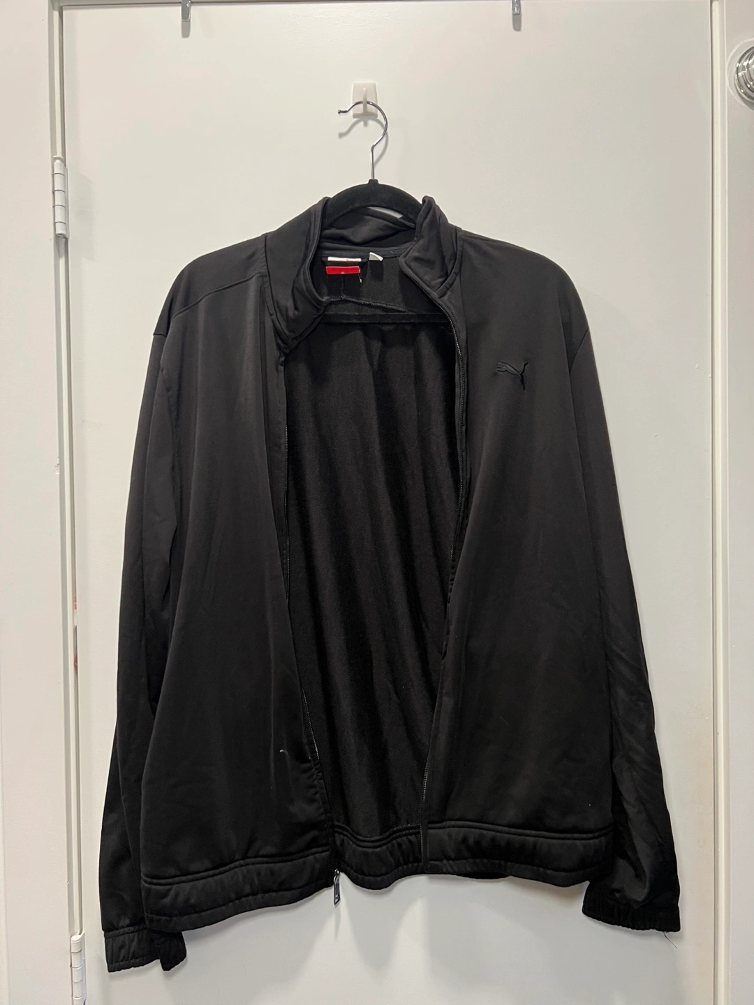 Black Puma Sport Lifestyle zip-up track jacket. Size medium. Long sleeves. Full zip closure. Embroidered Puma logo. Good condition.