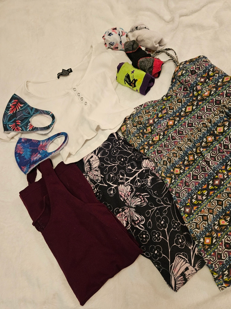 119Bundle includes a white cropped top, burgundy sleeveless top, patterned leggings, patterned dress, and a variety of socks. Two reusable face masks included. small size no longer needed