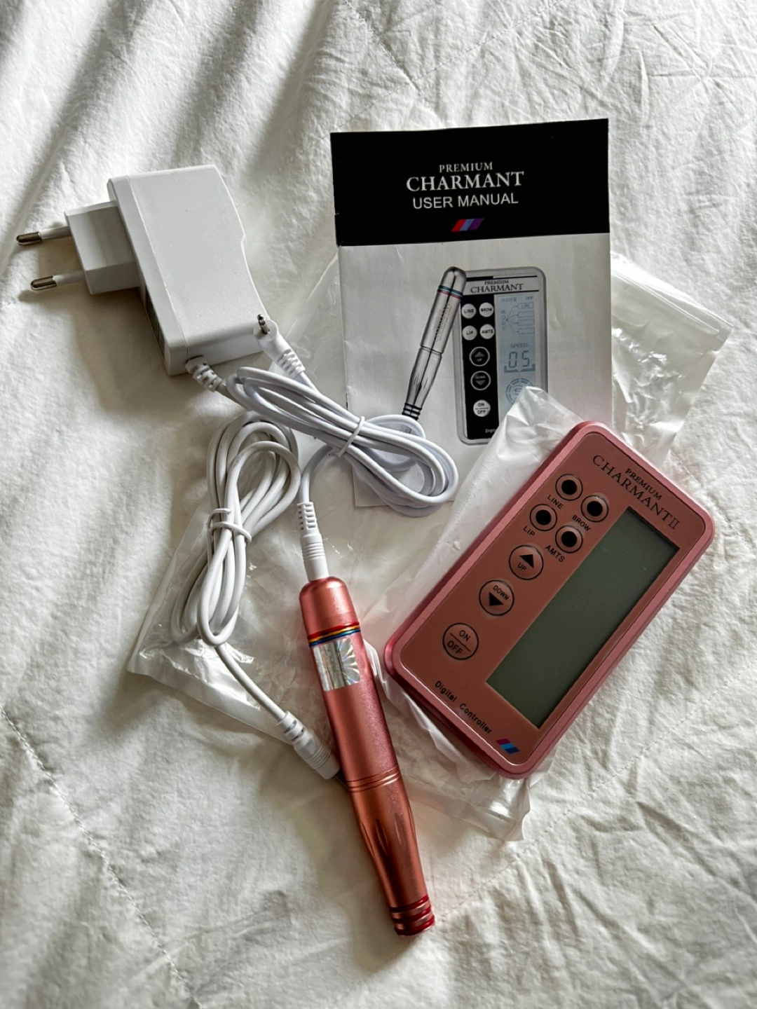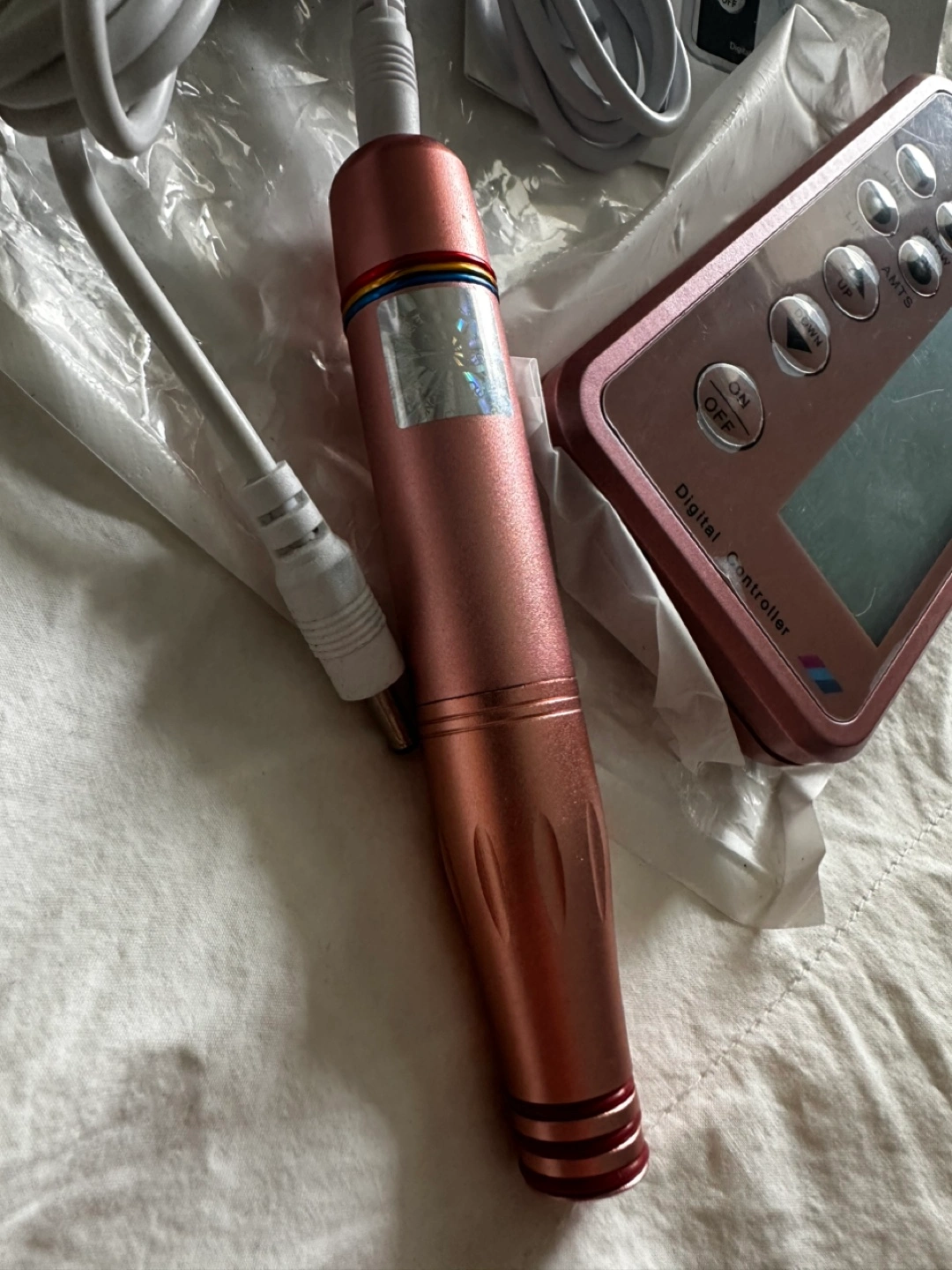 Rose gold permanent makeup machine. Includes digital controller, power supply, and instruction manual. Excellent for eyebrows, lips, and eyeliner. Self pickup at Coquitlam Parkway Blvd