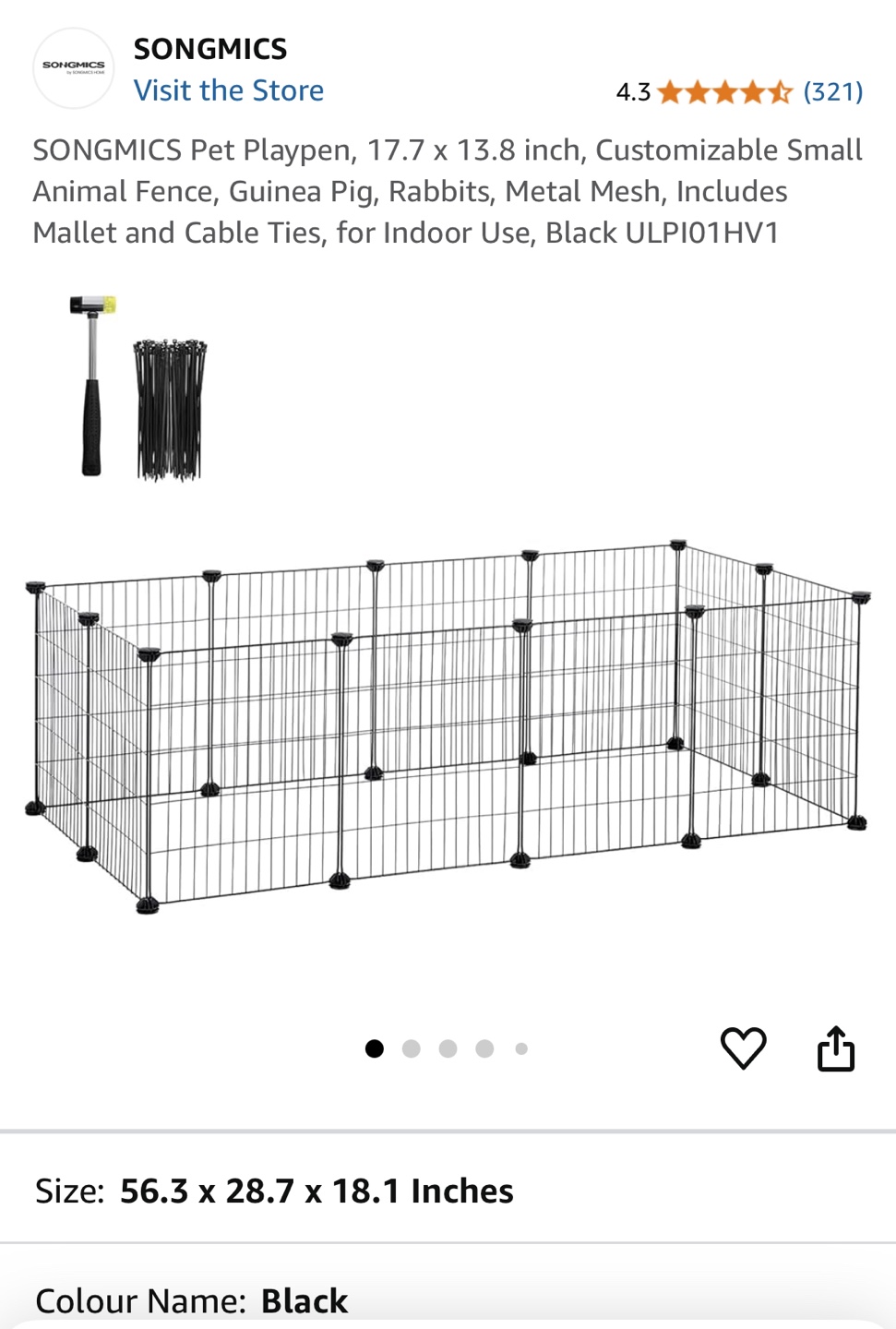 Black metal pet playpen. Customizable small animal fence. Suitable for guinea pigs, rabbits and small dogs. Indoor use. Includes mallet and cable ties. Approximately 56.3 x 28.7 x 18.1 inches.