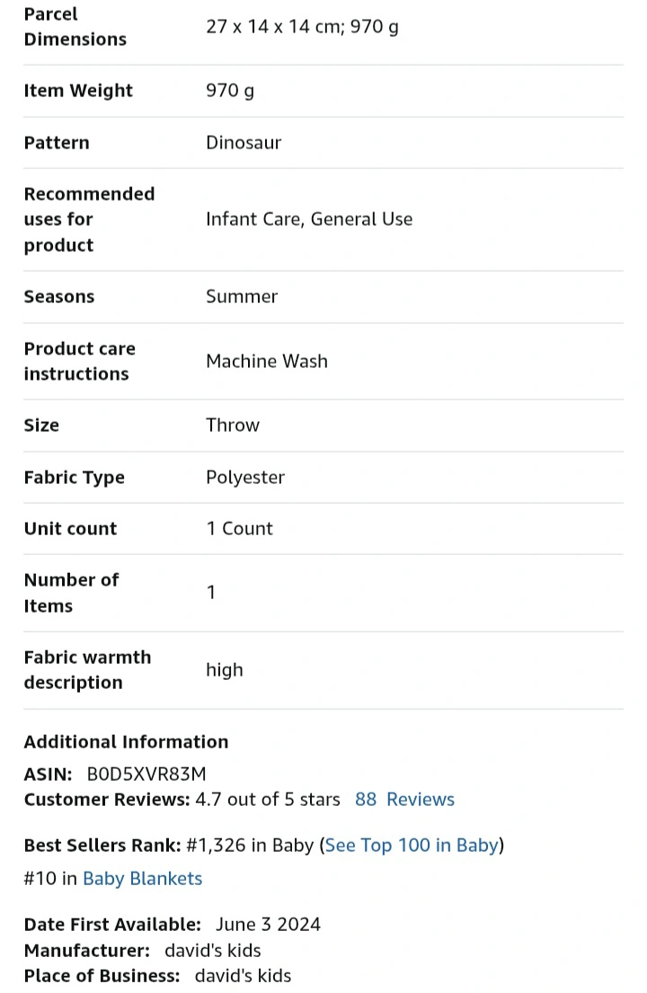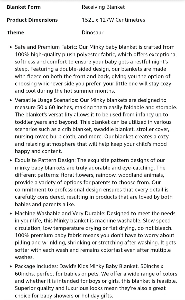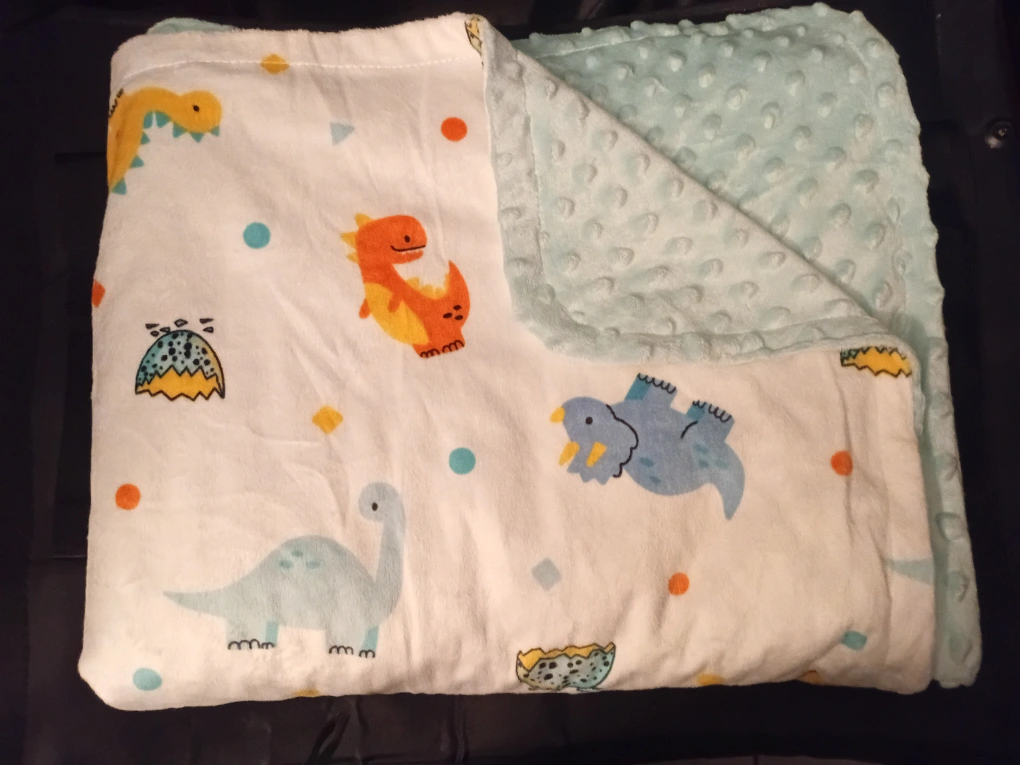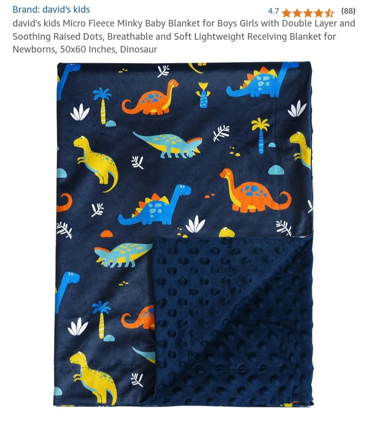 Soft, breathable, and skin-friendly baby blanket. Features a cute dinosaur pattern. Perfect for newborns. Lightweight and super soft. Double layered with raised dots. Measures 50x60 inches.