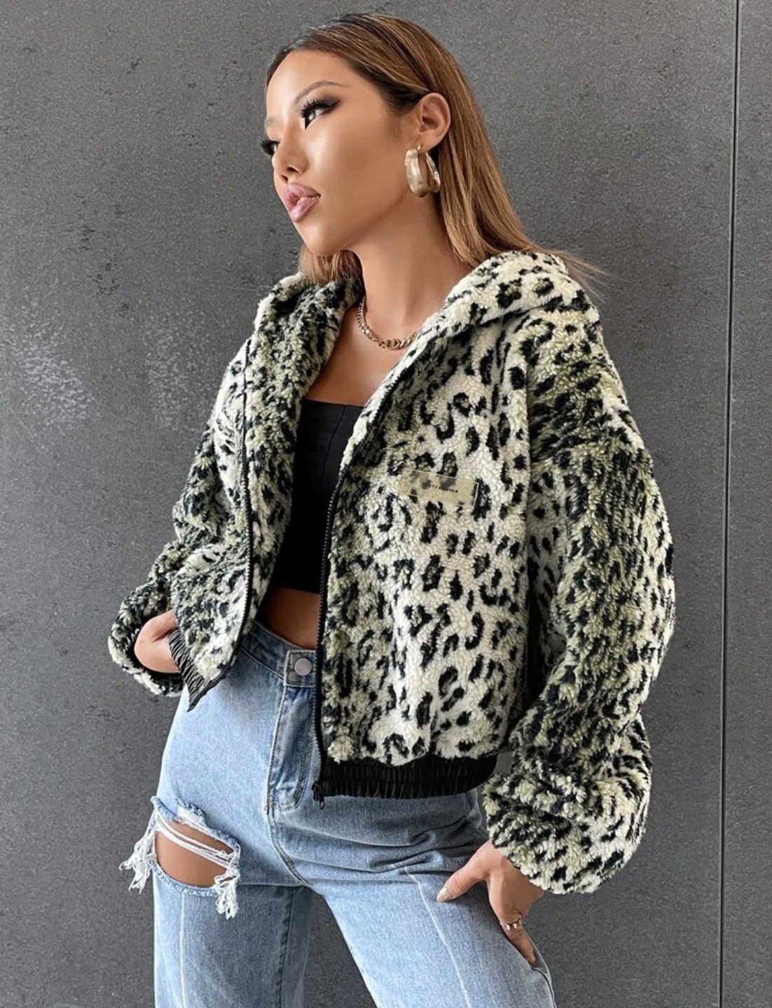 Women's cropped zip-up jacket. Features a plush fleece material and an all-over leopard print. Relaxed fit. Perfect for layering.