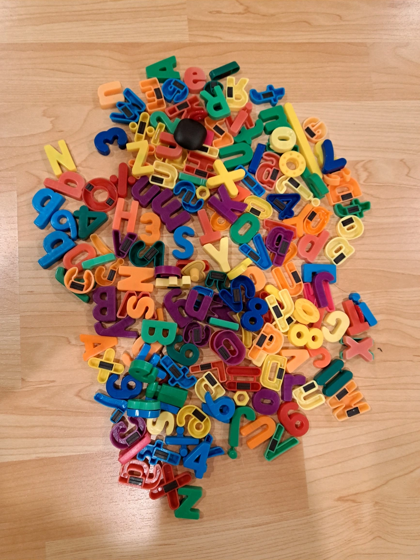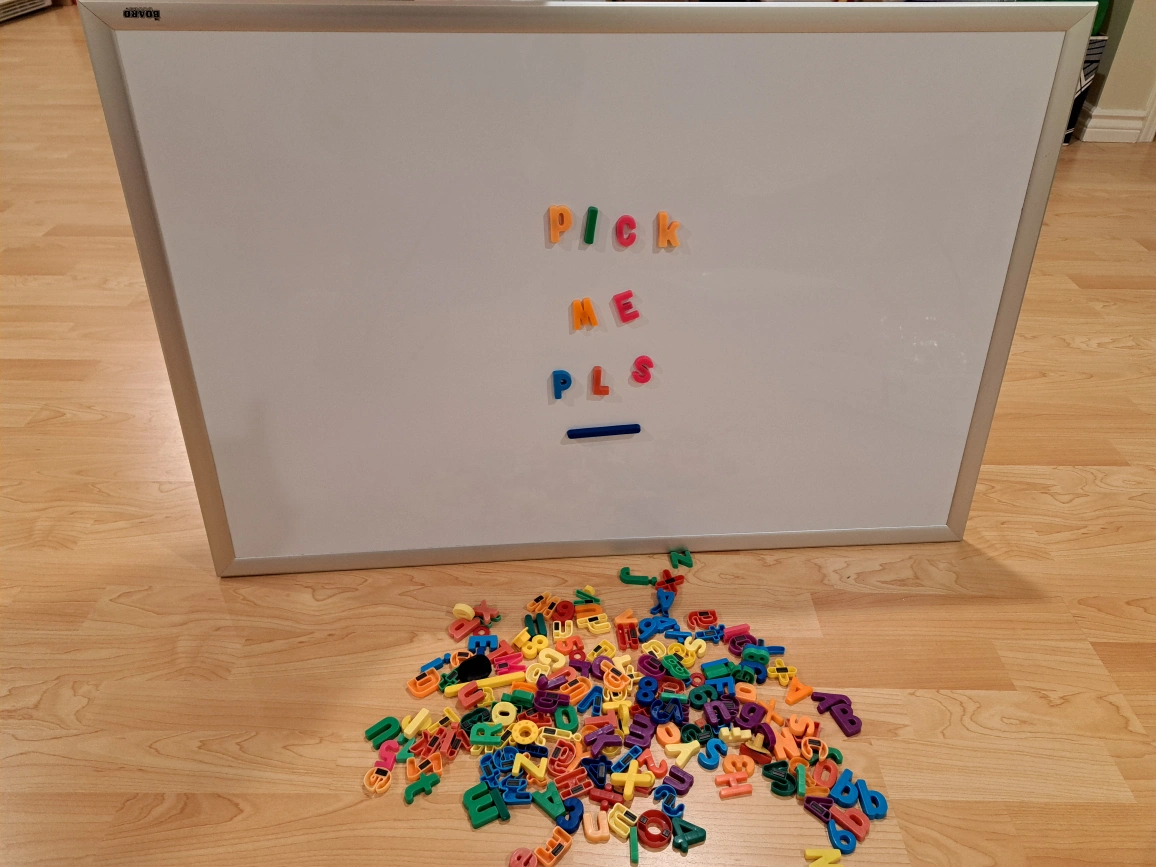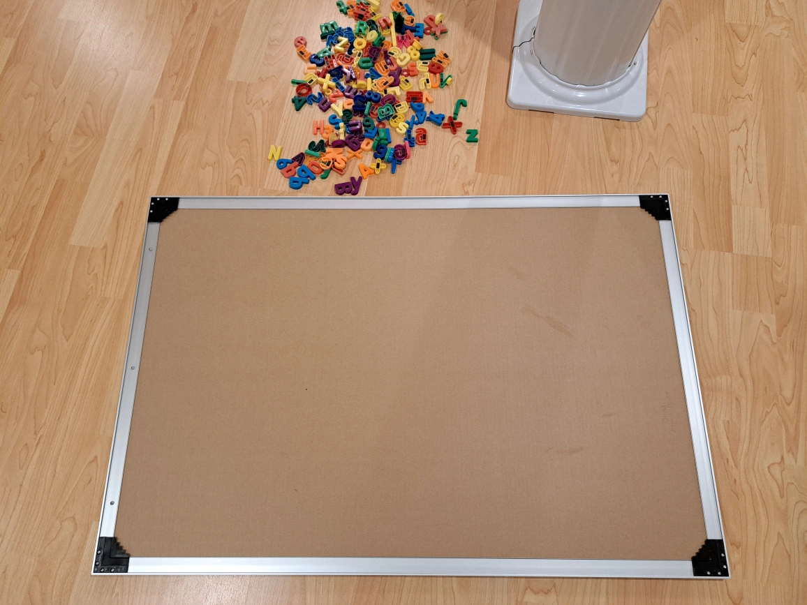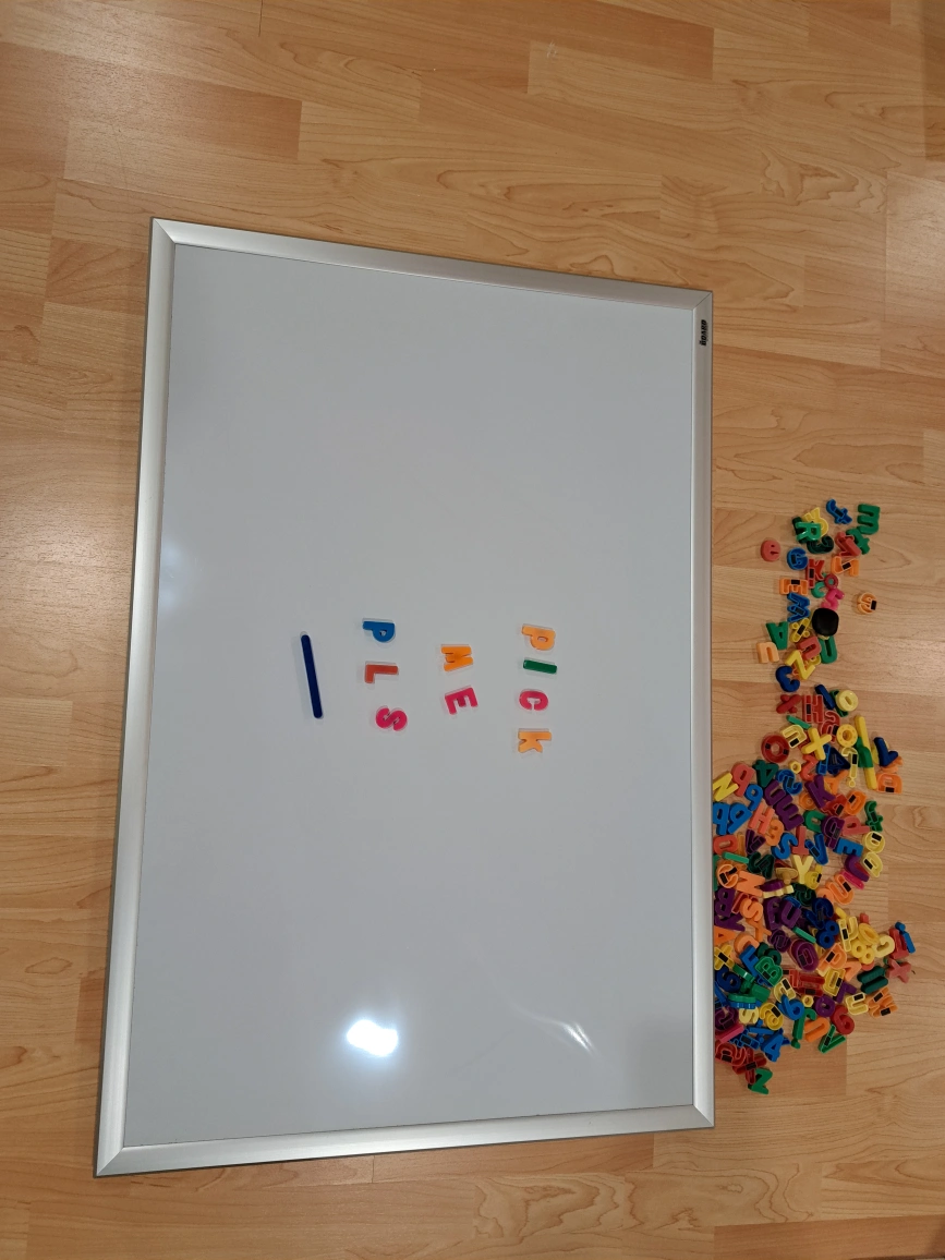 570Large magnetic whiteboard, silver frame. Includes a large quantity of colourful magnetic alphabet letters and numbers. Great for kids' learning.
