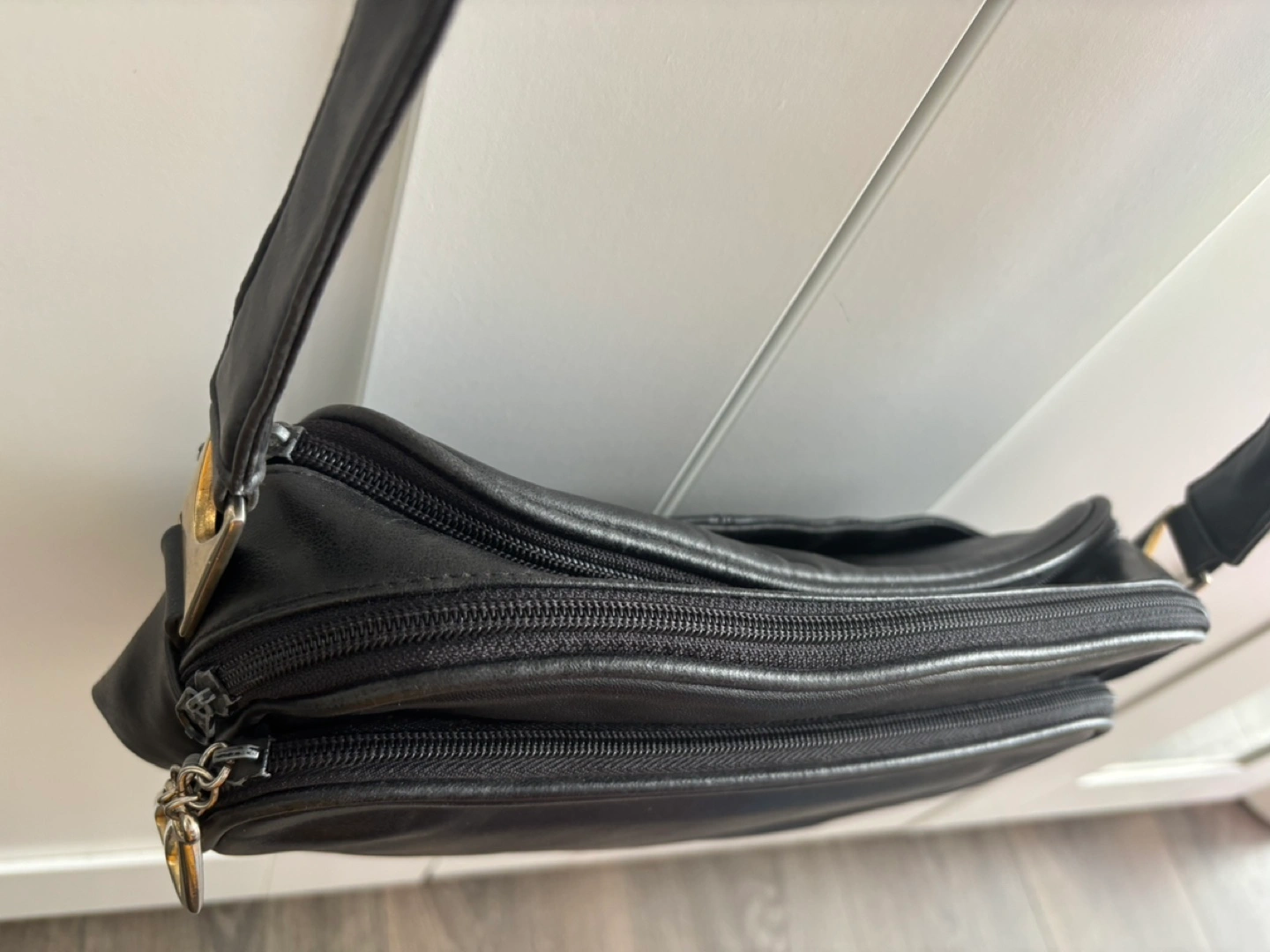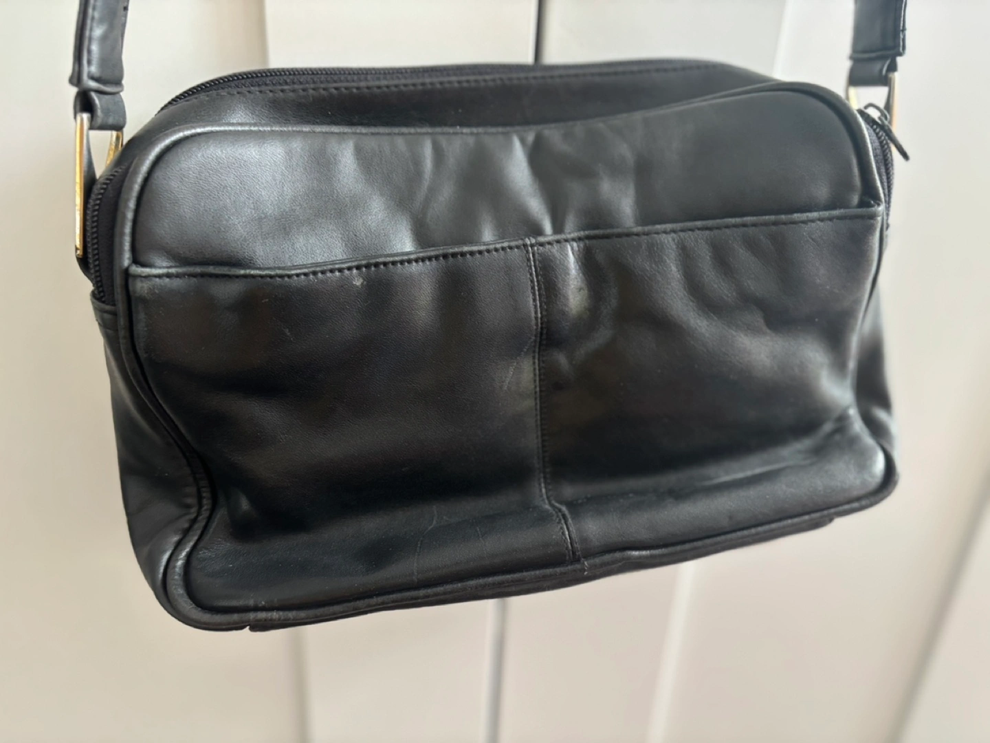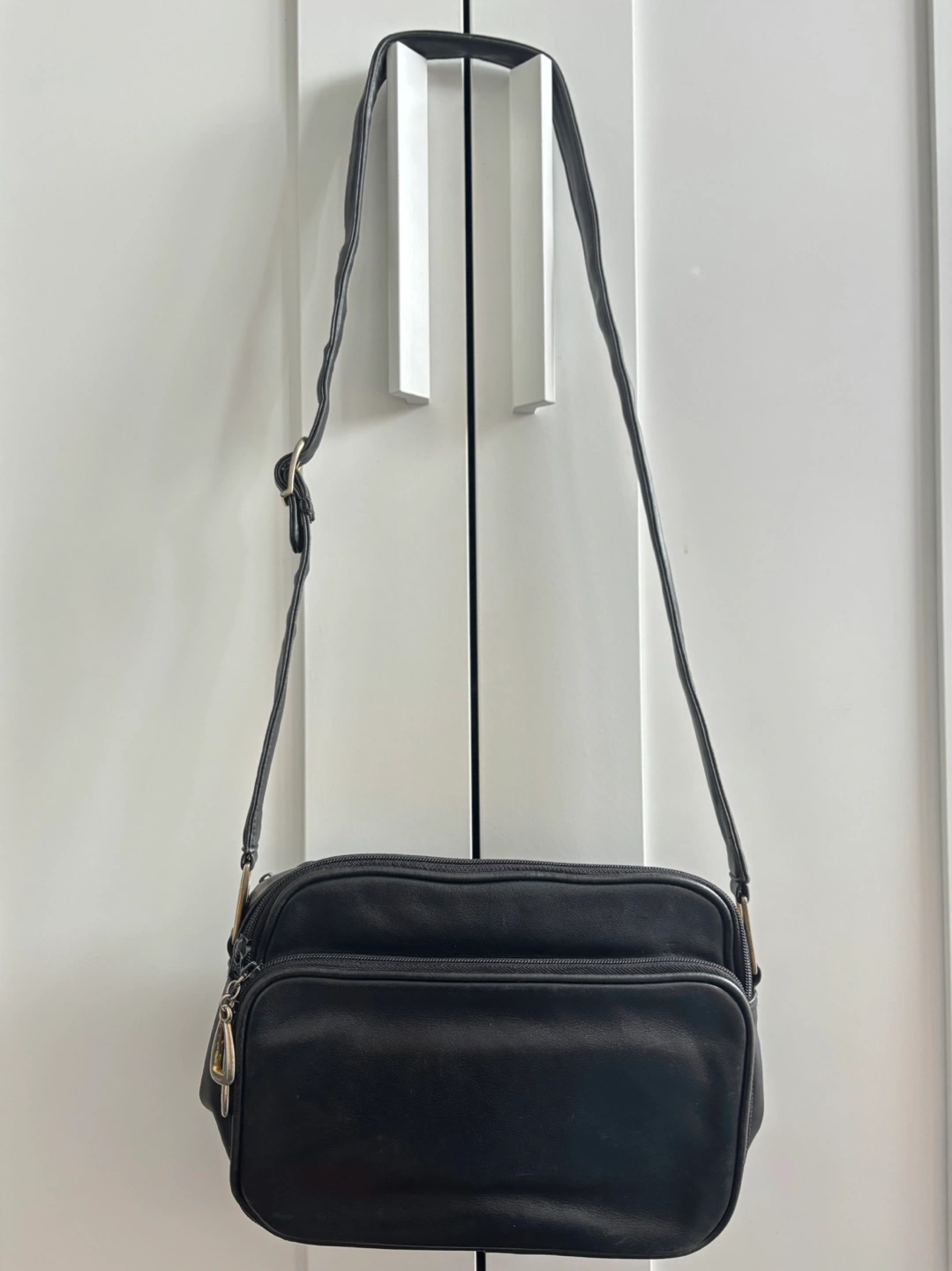 Small black leather crossbody bag.