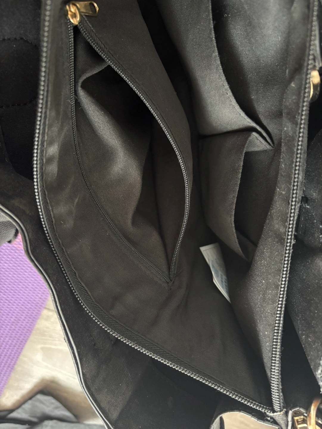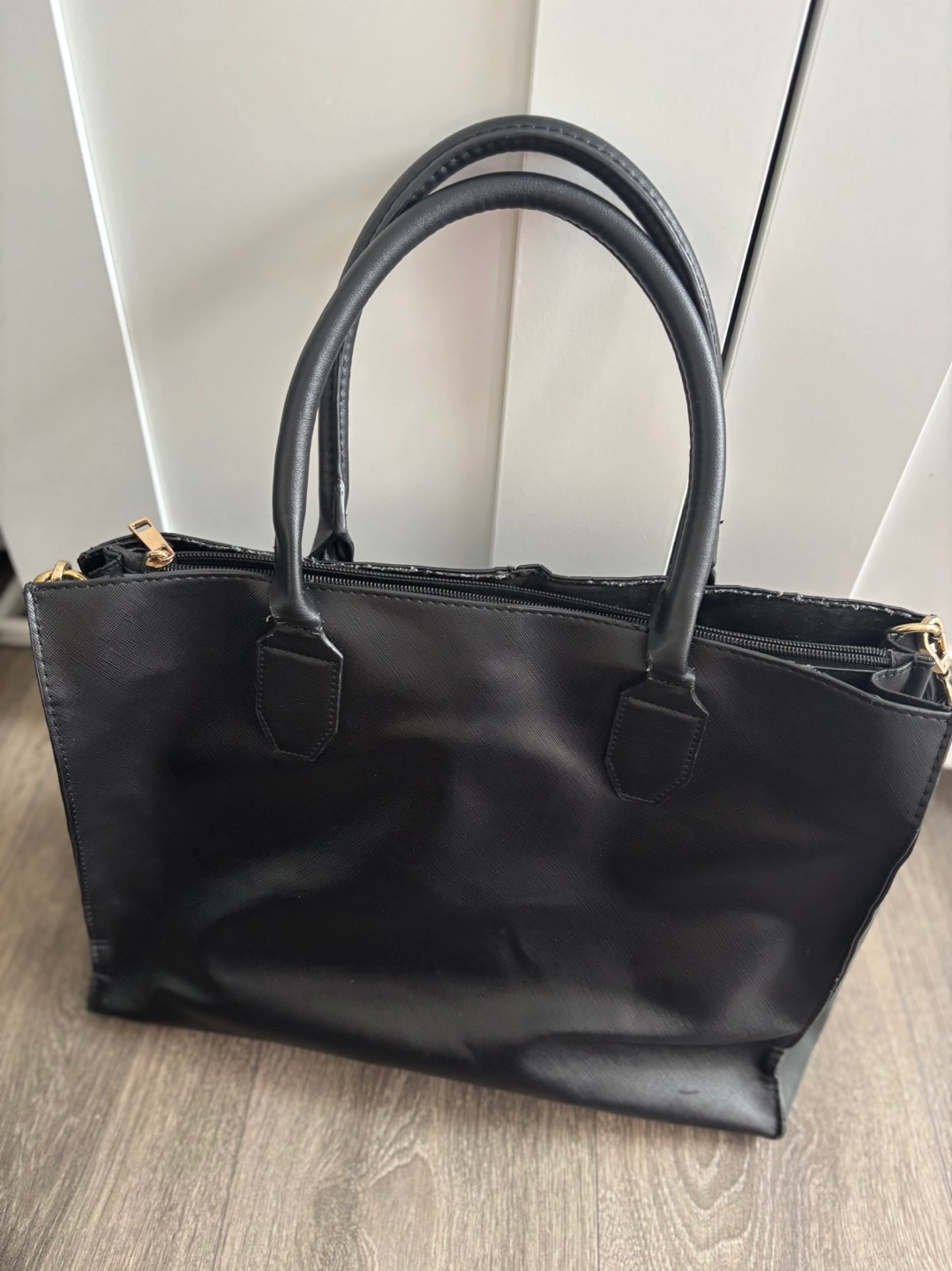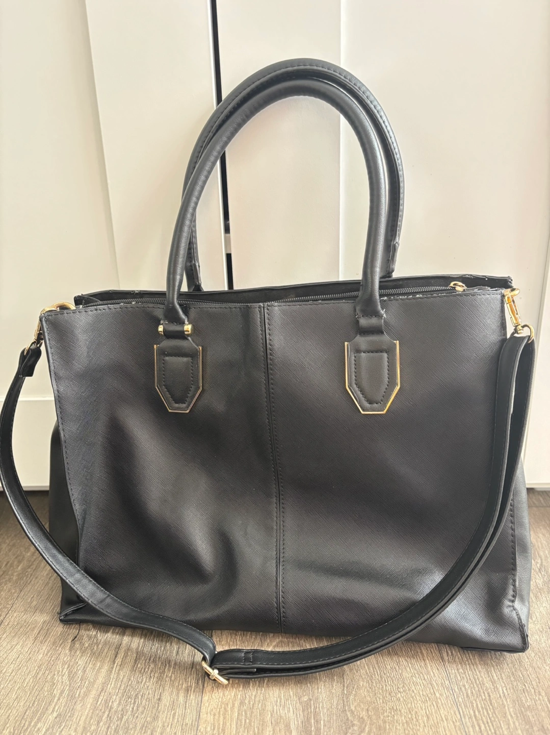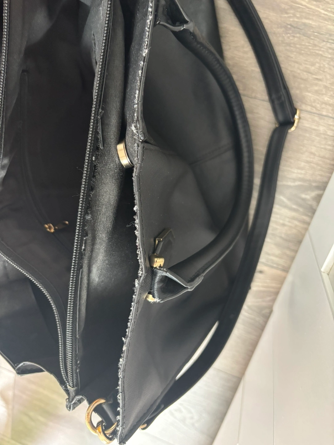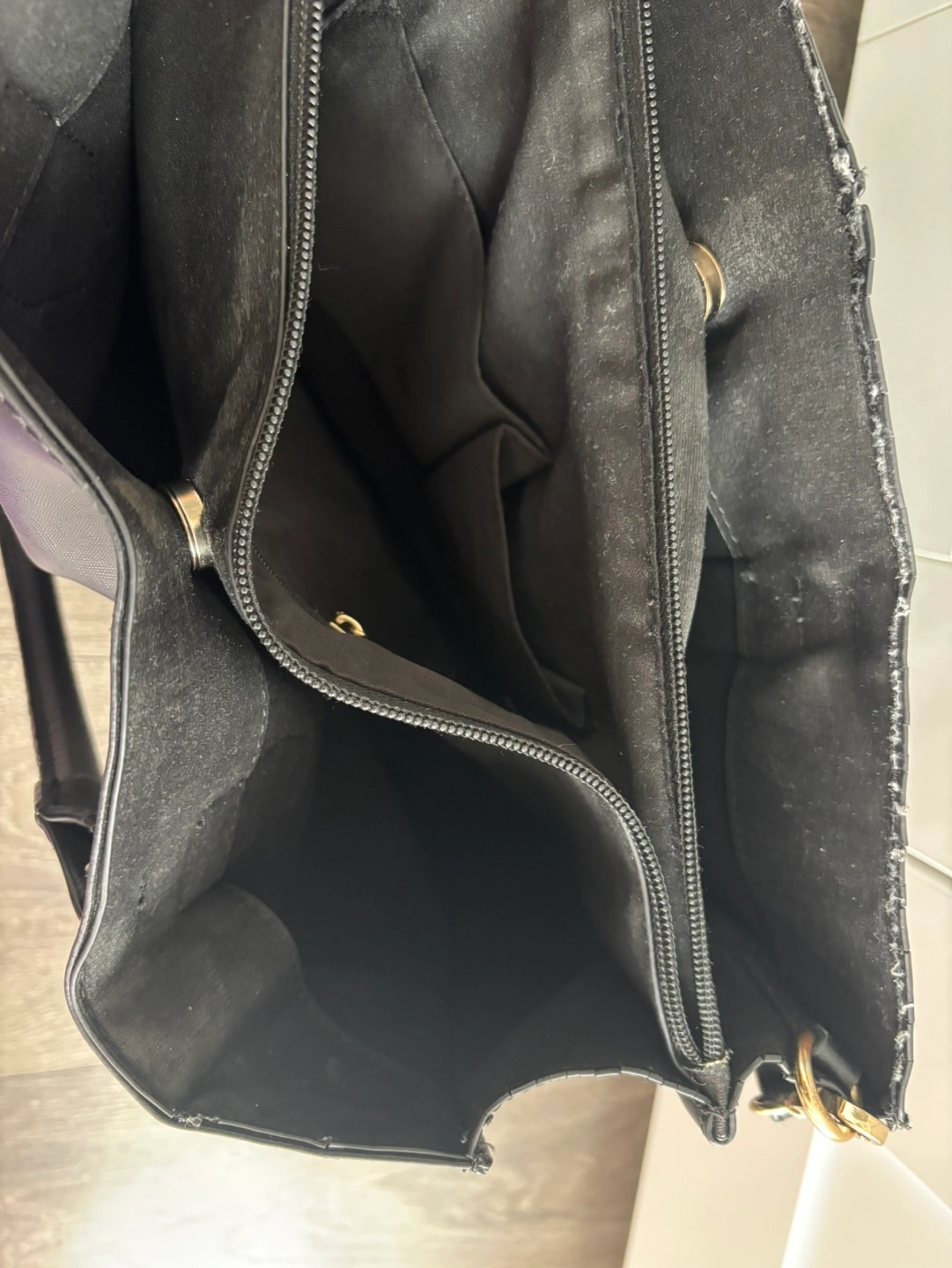 Two top handles, detachable shoulder strap. Zipper closure. Interior pockets. Minor wear and tear one side at the edge.