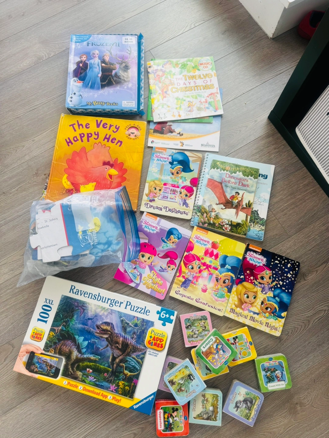 Large bundle including Frozen II book, The Very Happy Hen, The Twelve Days of Christmas, Shimmer and Shine books, Dinosaurs Before Dark, Ravensburger 100-piece dinosaur puzzle, and various card games. Great for young children.