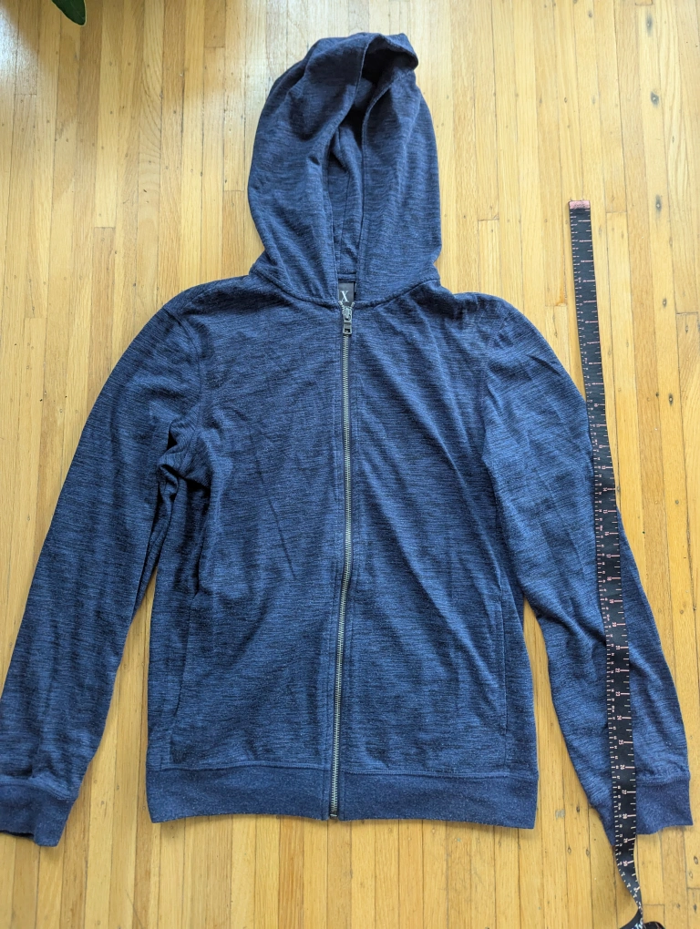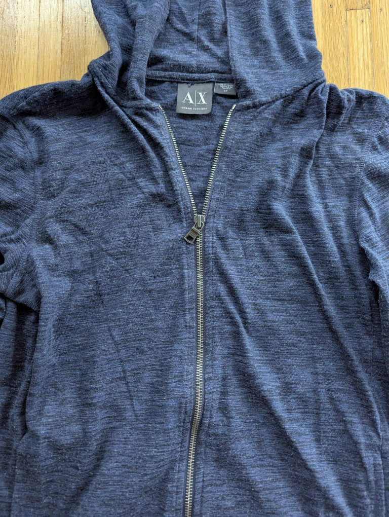 Men's navy blue zip-up hoodie. Soft material. Good for layering. Size small. Some pilling, otherwise good condition.