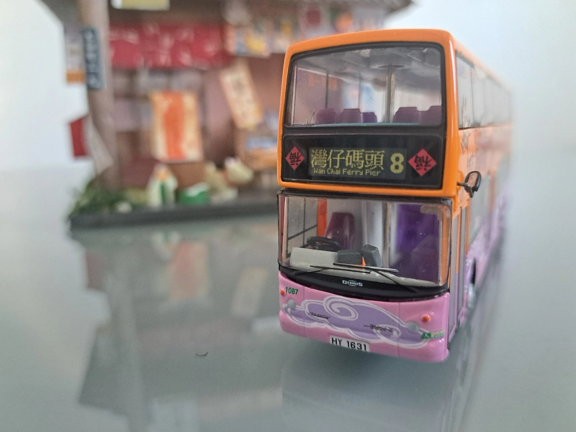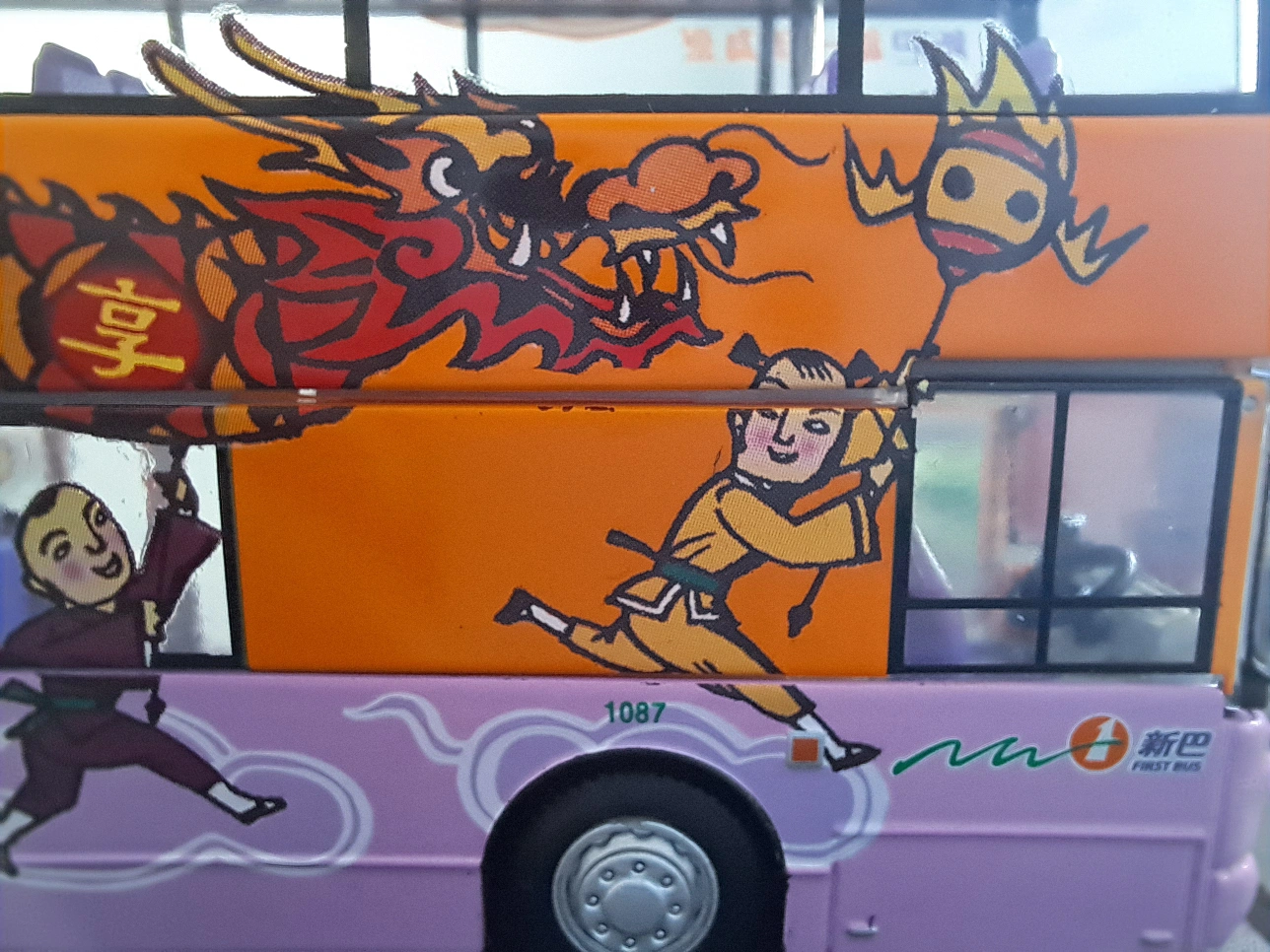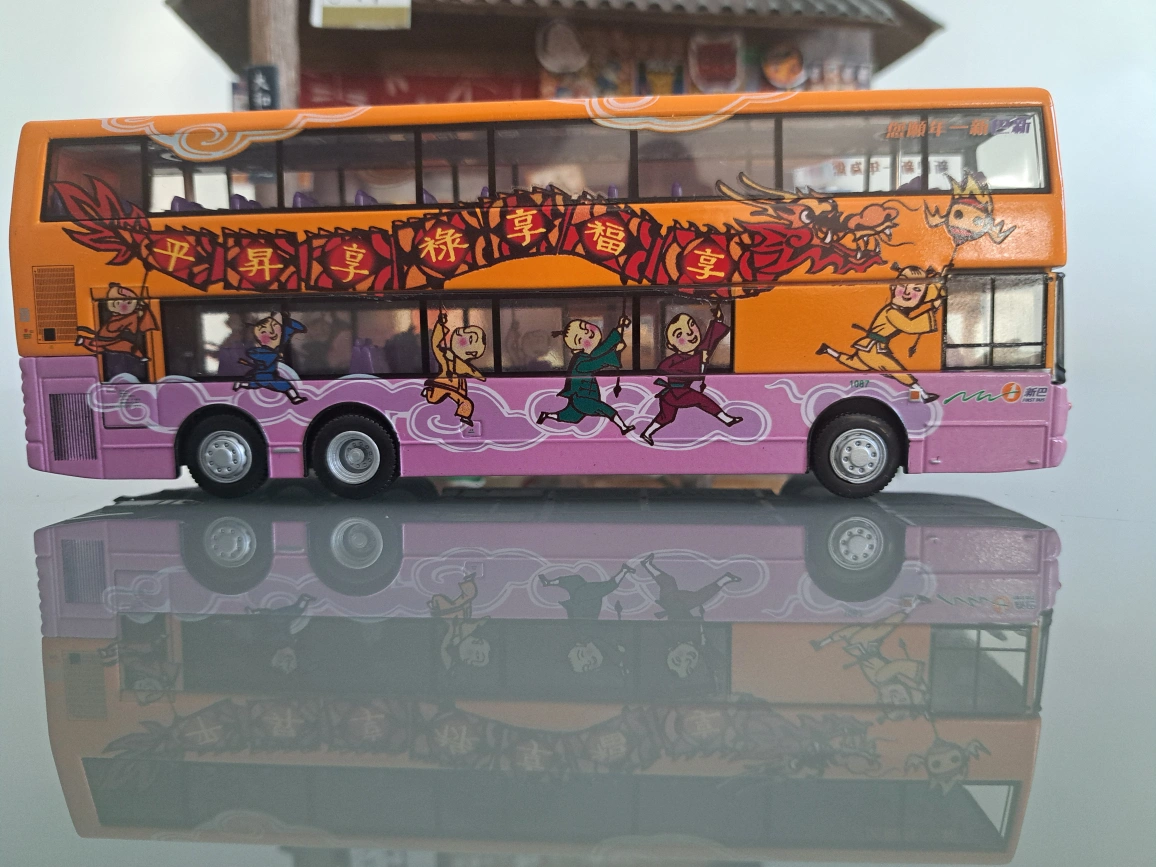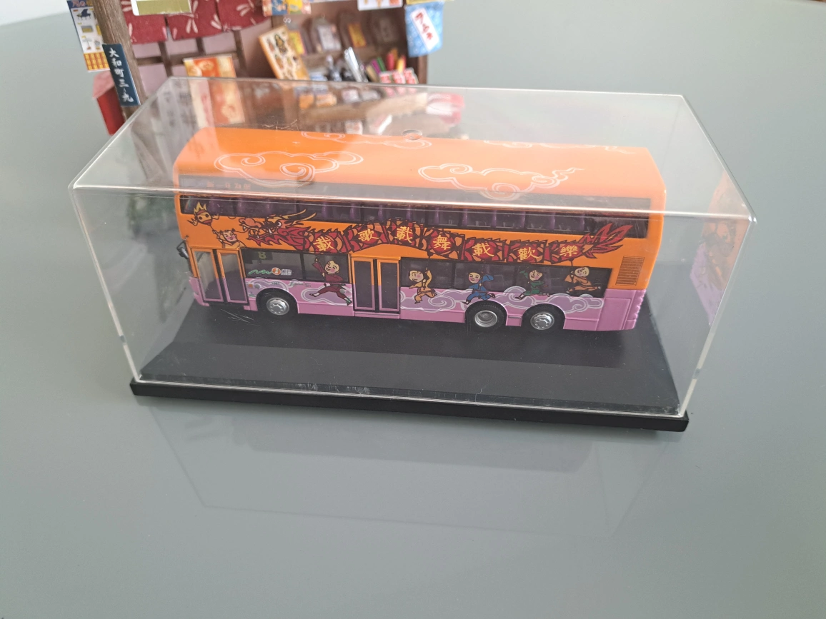 Collectible double-decker bus model. Features vibrant orange and purple design. Dragon and children illustrations. Route number 8 displayed. Excellent condition.