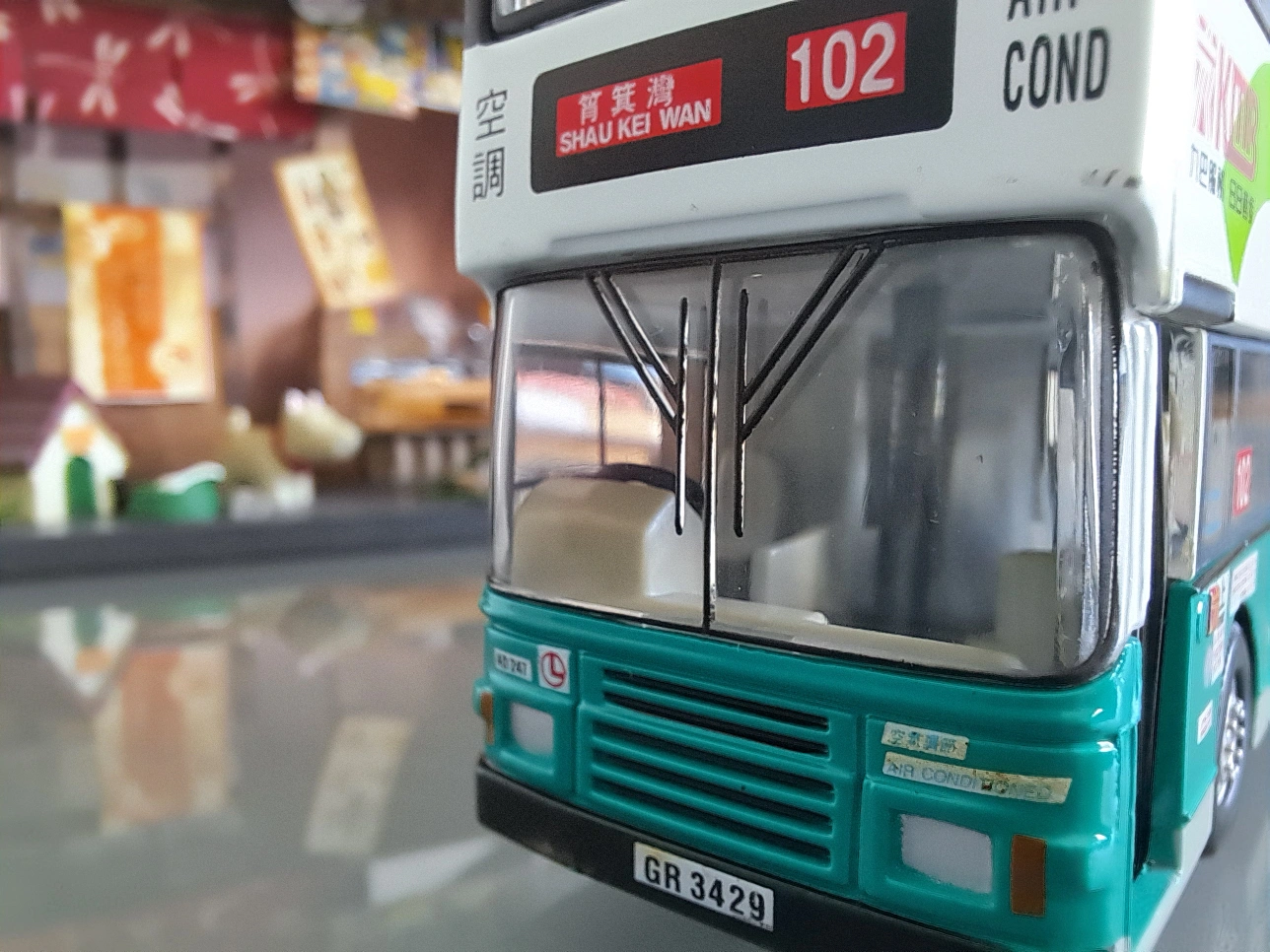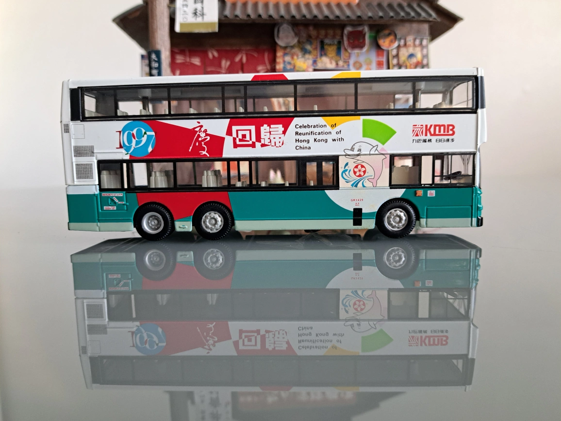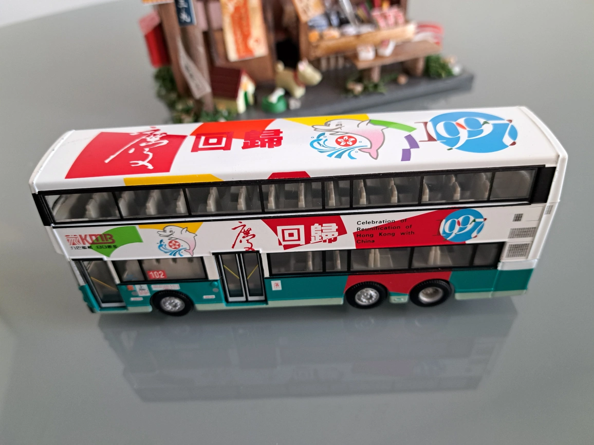 Collectible diecast model of a Kowloon Motor Bus (KMB) double-decker bus. Route number 102. Features celebratory 1997 Hong Kong handover livery. Great for collectors.