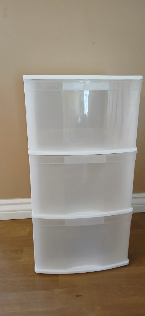White plastic storage unit. Three drawers. Ideal for organizing small items. Lightweight and easy to move.