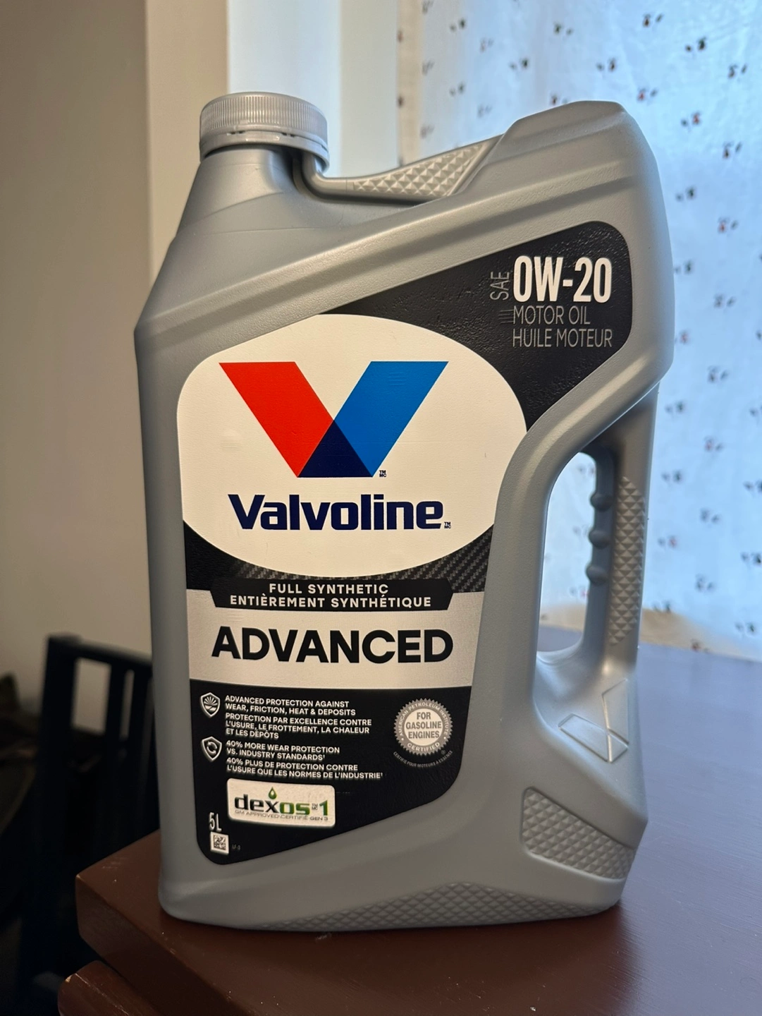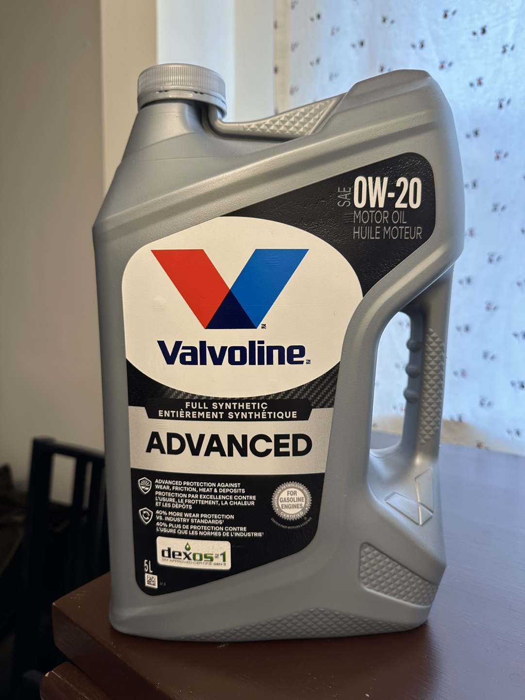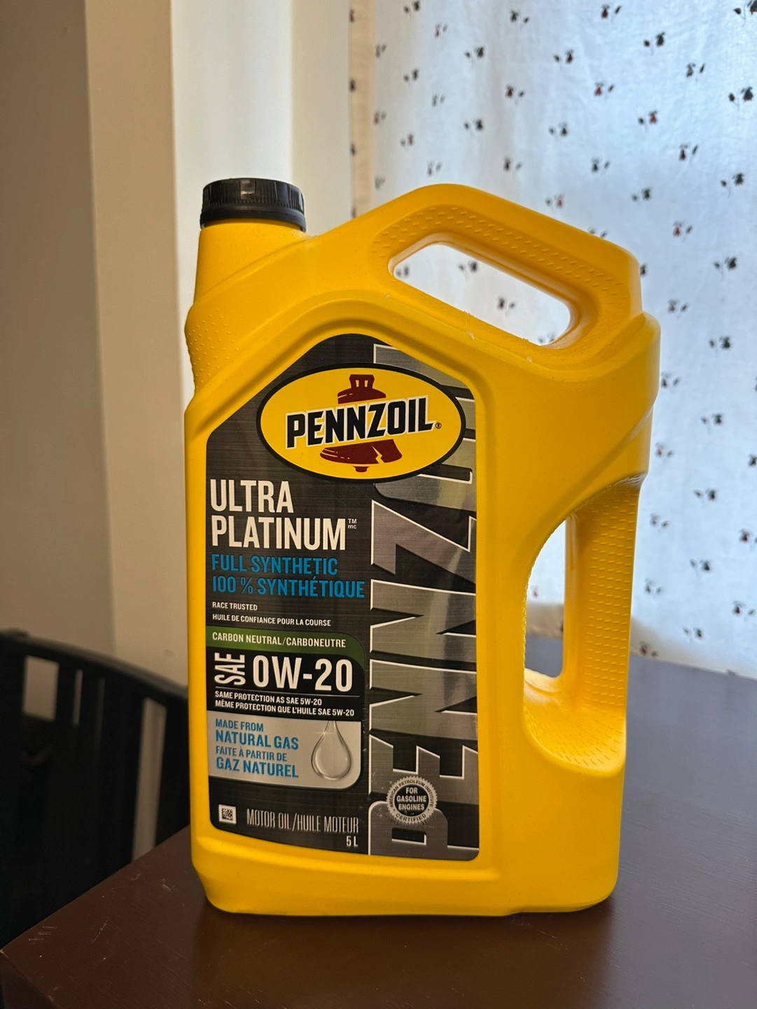 Two 5L jugs of motor oil. One Valvoline Advanced Full Synthetic 0W-20 and one Pennzoil Ultra Platinum Full Synthetic 0W-20. Both are new and unopened.