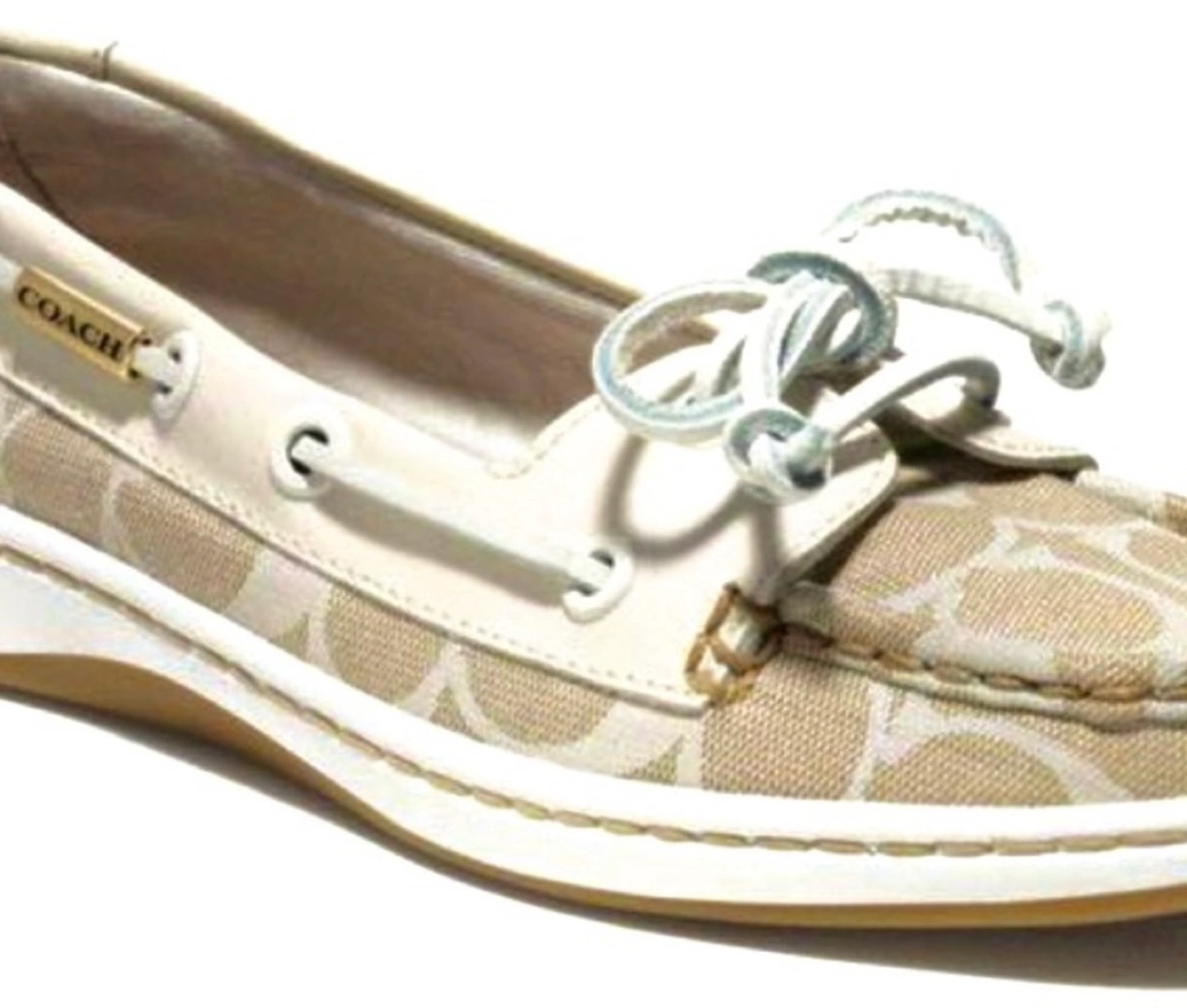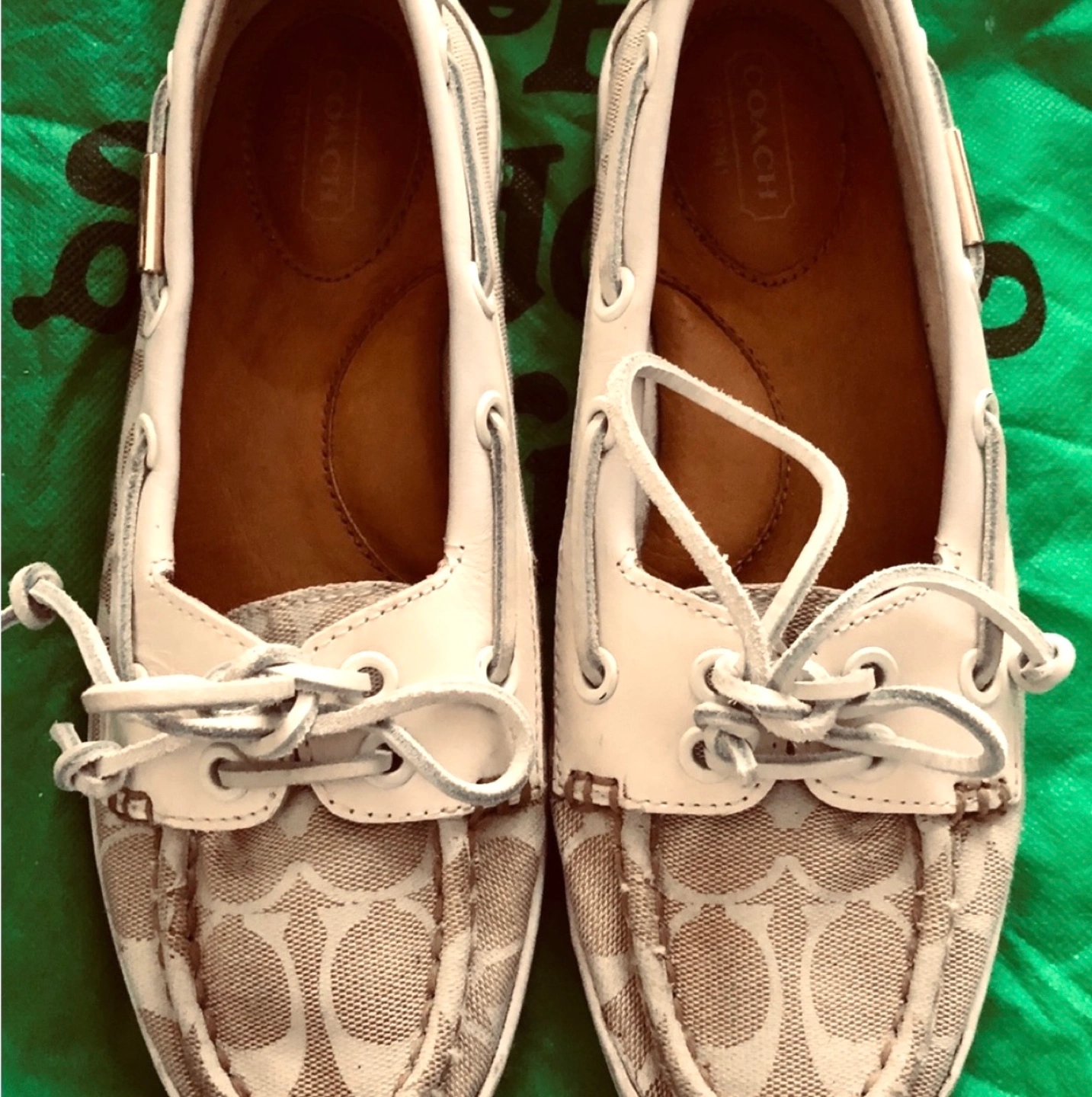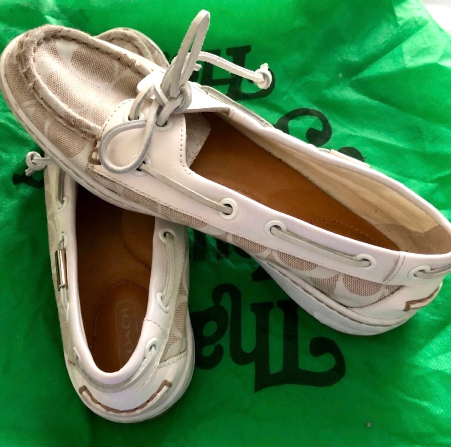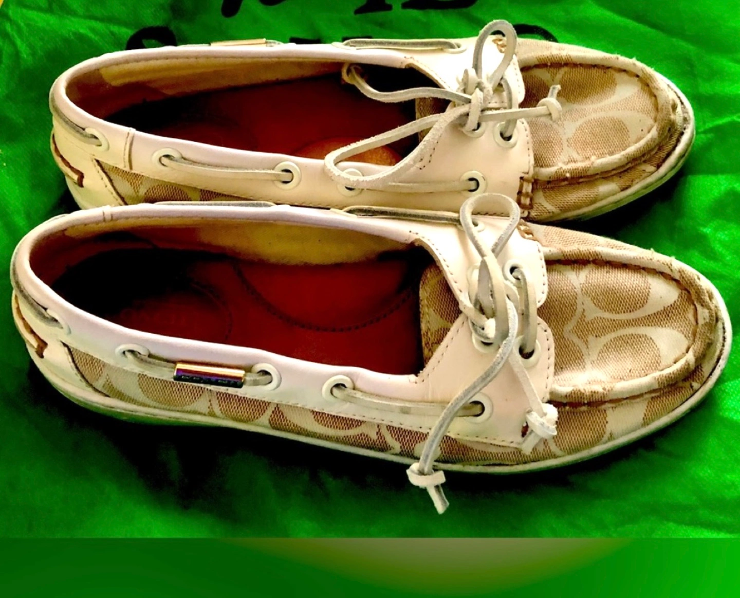 Coach Beige and white canvas boat shoes. Lace-up closure. Lightly worn. Pre-owned.