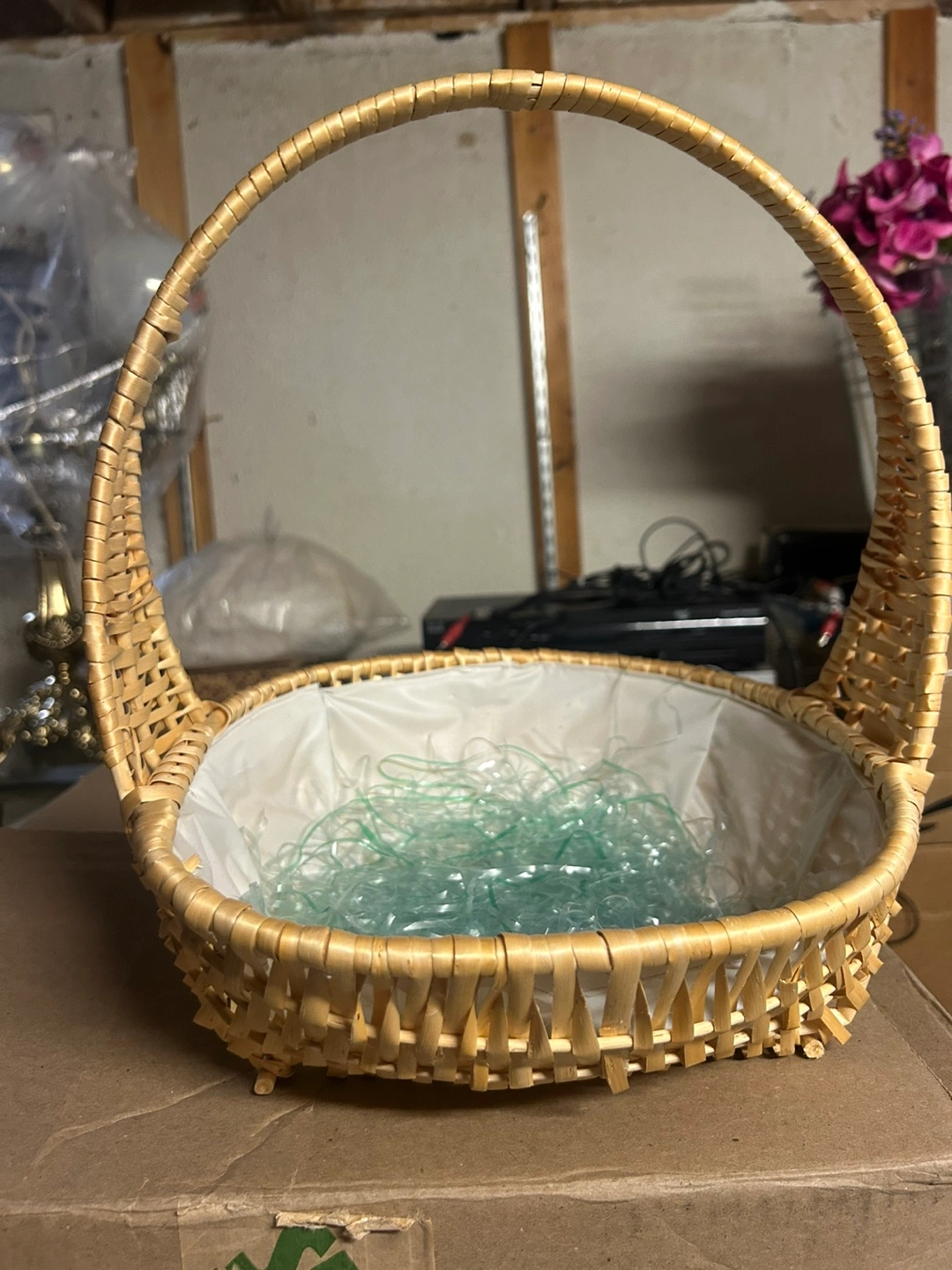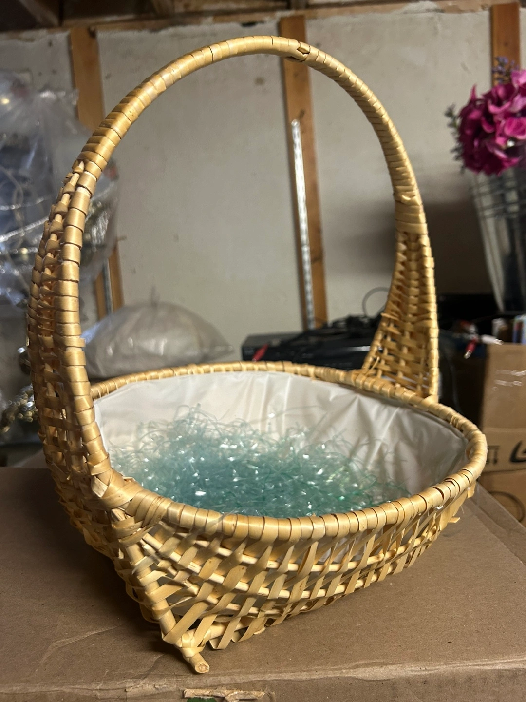 Adorable vintage wicker basket. Features a sturdy handle and a lined interior. Perfect for Easter, gifting, or home decor.