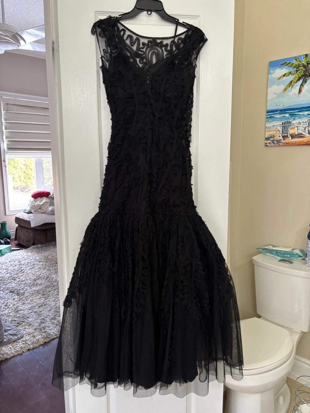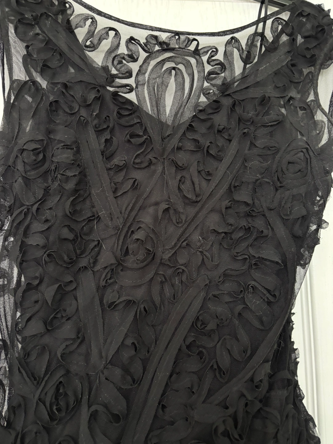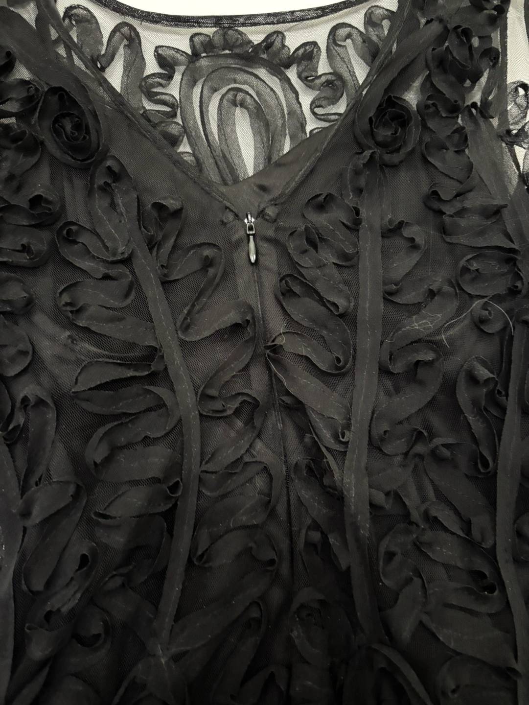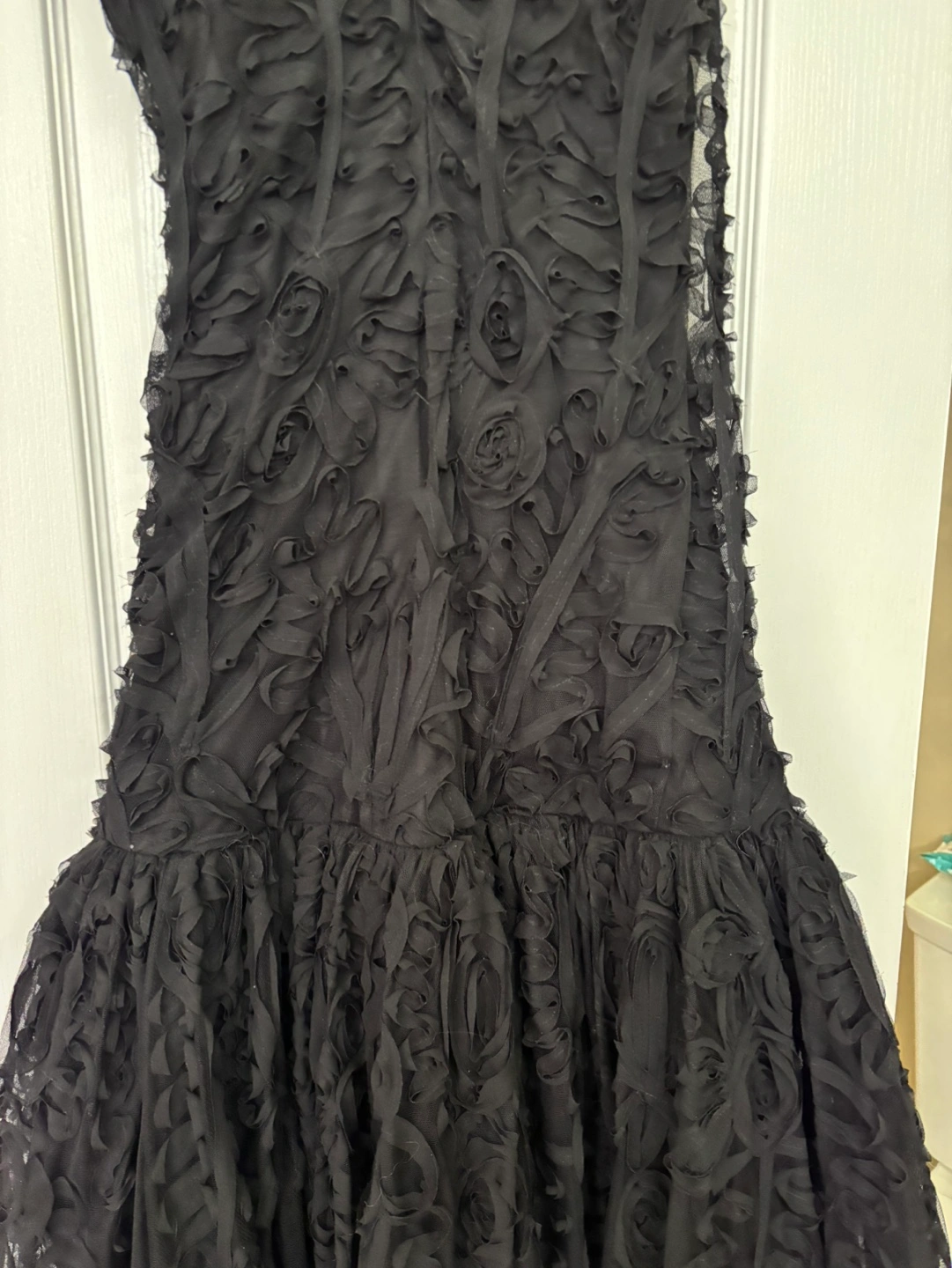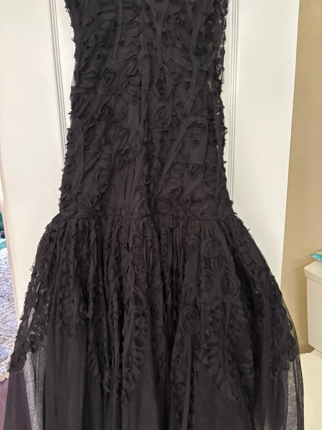 Stunning black formal gown. Original price $799.00. Features intricate floral detailing throughout. Sleeveless design. Floor-length. Back zipper closure. Elegant and sophisticated.