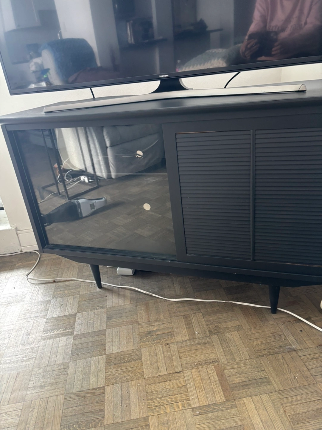 IMMEDIATE POSSESSION!Black TV stand. Mid-century modern style. Features a sliding glass-paned door and a sliding shutter door with drawer. Excellent for storing media and electronics or as cabinet. Some minor wear.