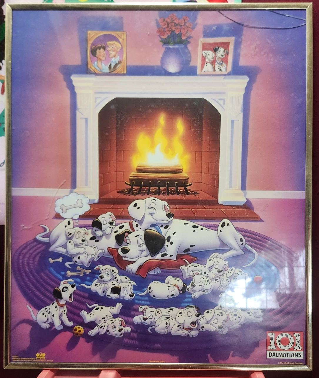 One print depicts the Dalmatian family in a cuddle puddle by a fireplace;