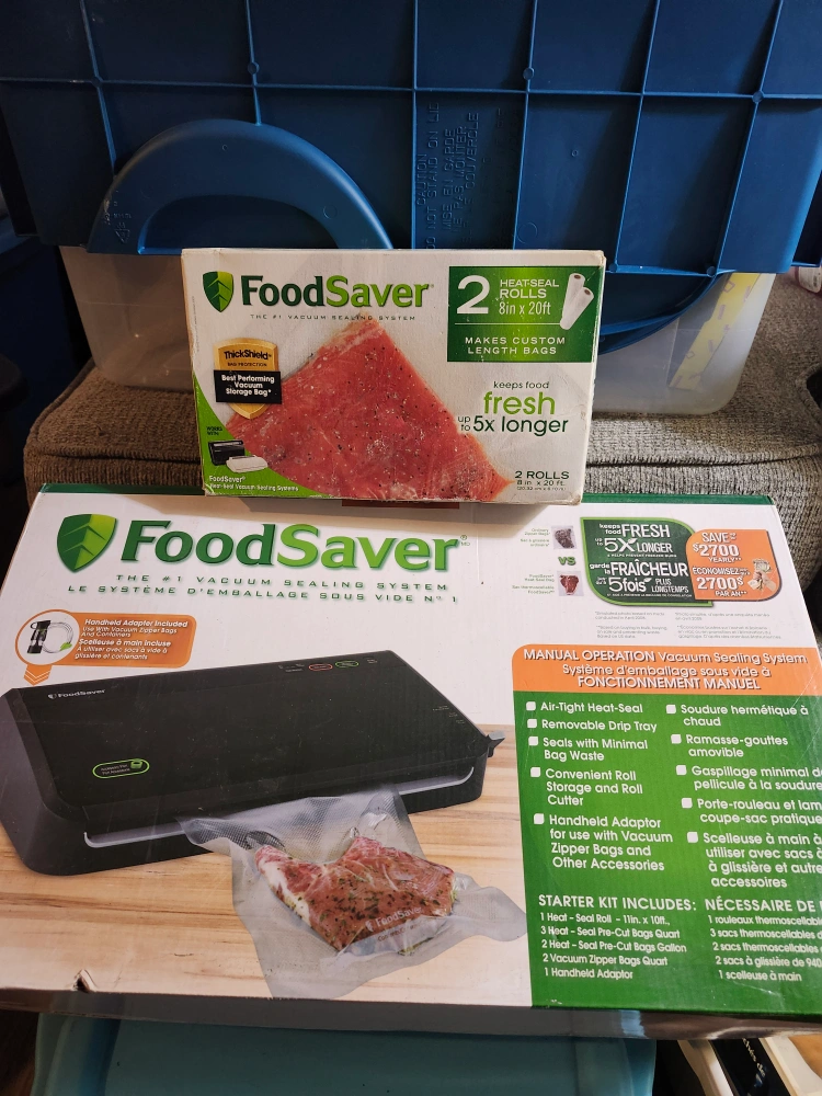 FoodSaver vacuum sealer system. Includes handheld adapter, heat-seal rolls, and pre-cut bags. Great for preserving food.