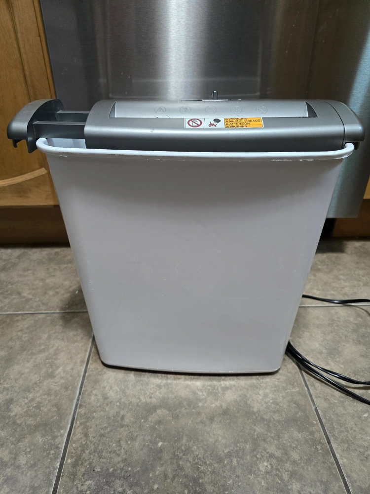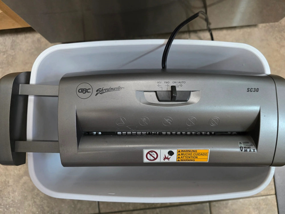 GBC Shredmaster SC30 paper shredder. Great for home or office use. Compact design. Includes power cord. auto feed doesn't always work. but fwd and reverse do