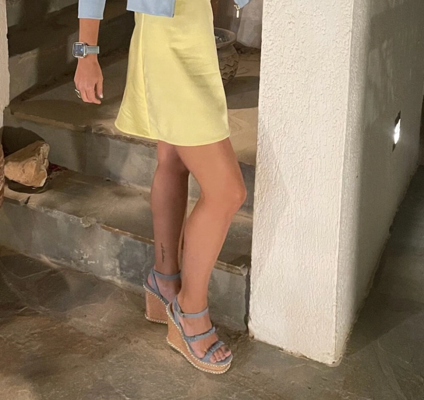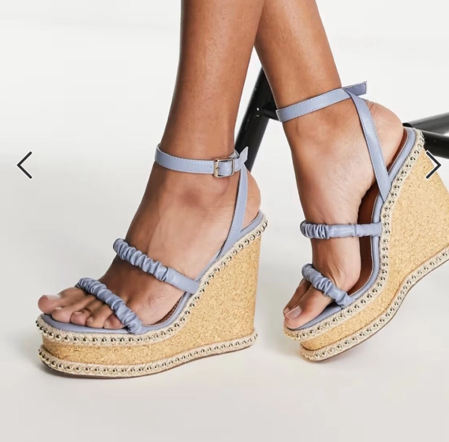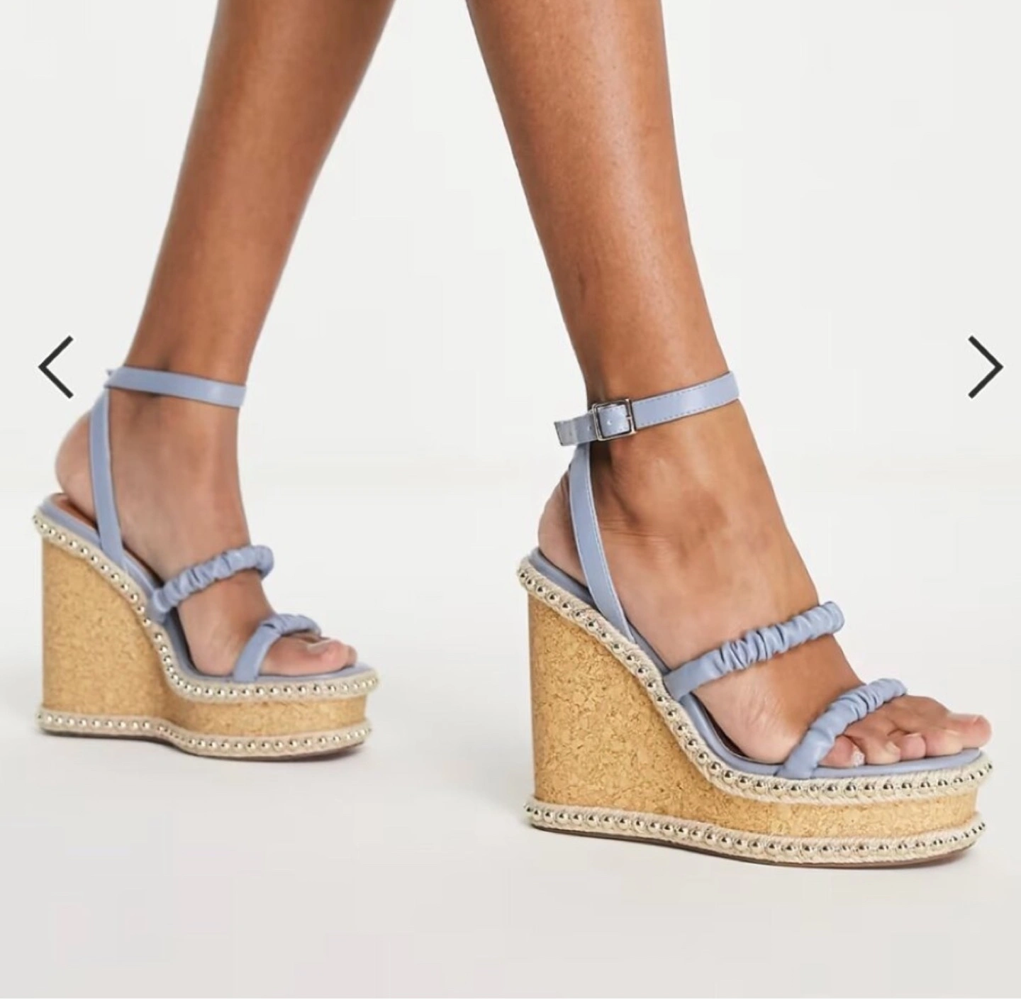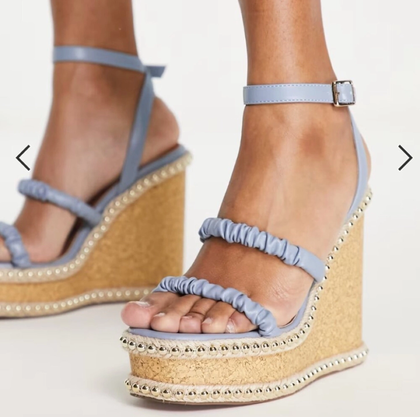 Beautiful dusty blue cork wedge sandals. Features three straps, ankle buckle fastening, and studded platform. Perfect for summer.