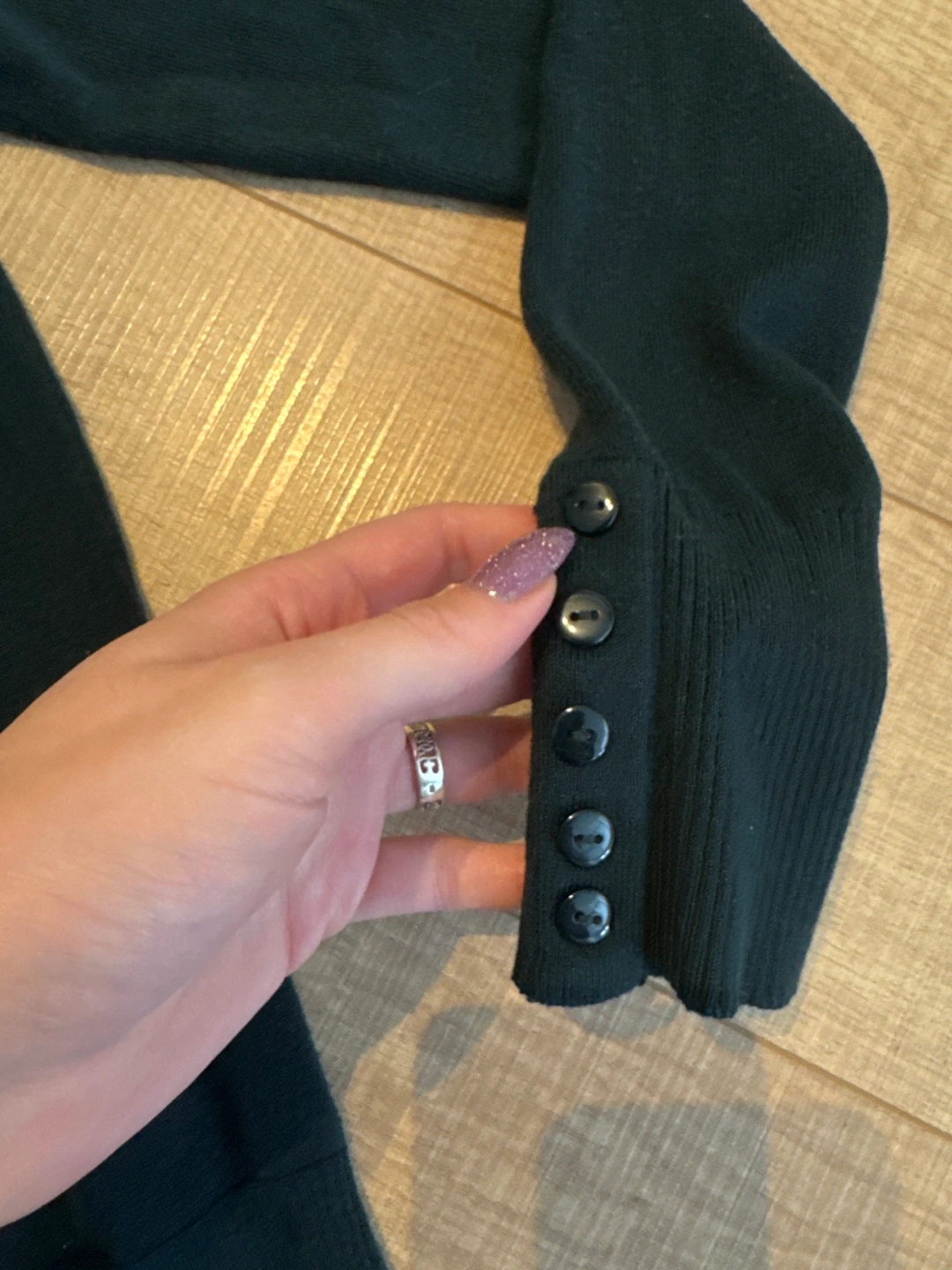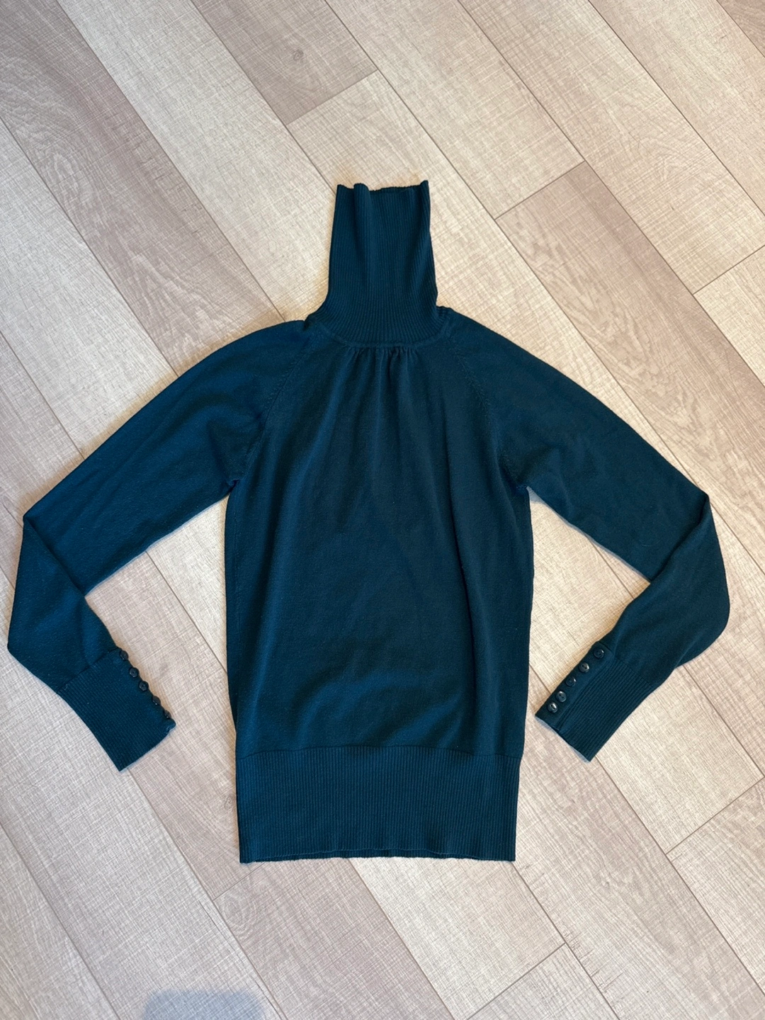 Dark green turtleneck sweater. Long sleeves with button detailing at cuffs. Size Medium. Soft material, flattering fit.