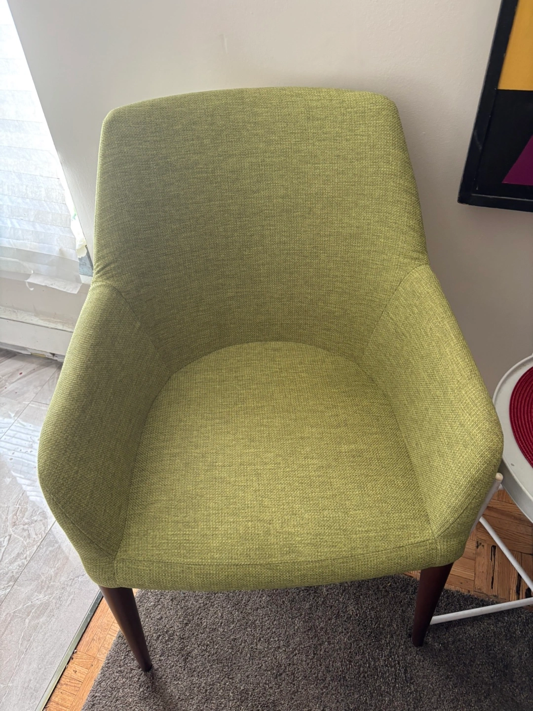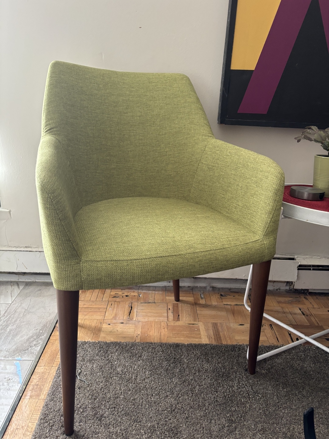 Comfortable armchair, lime green fabric upholstery. Dark brown wooden legs. Stylish and modern design. Perfect for living room or office.