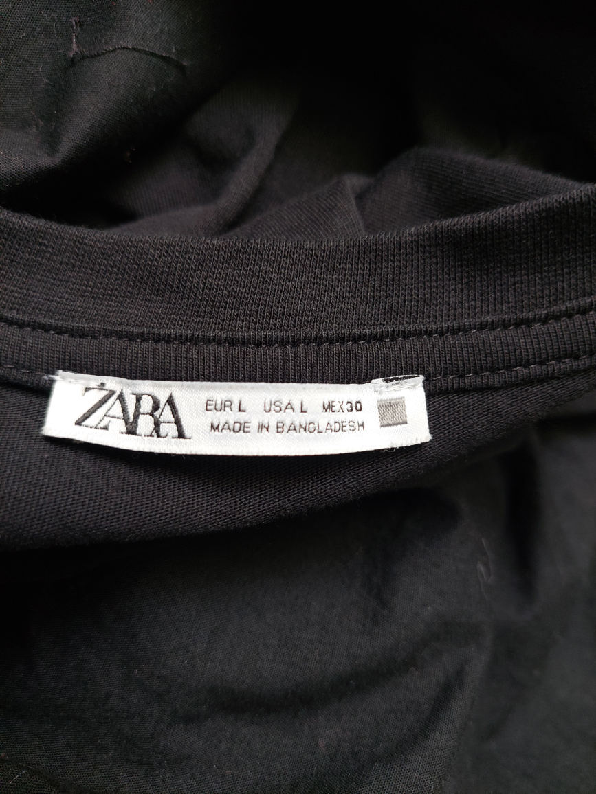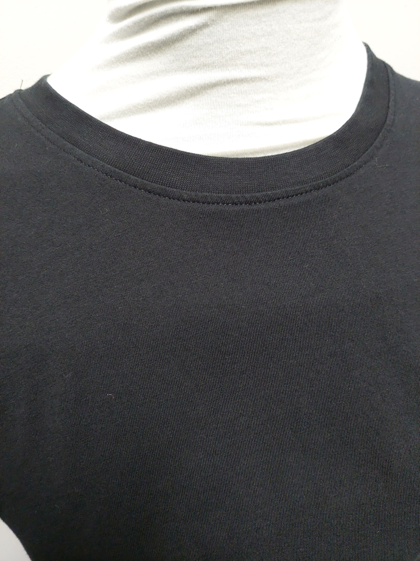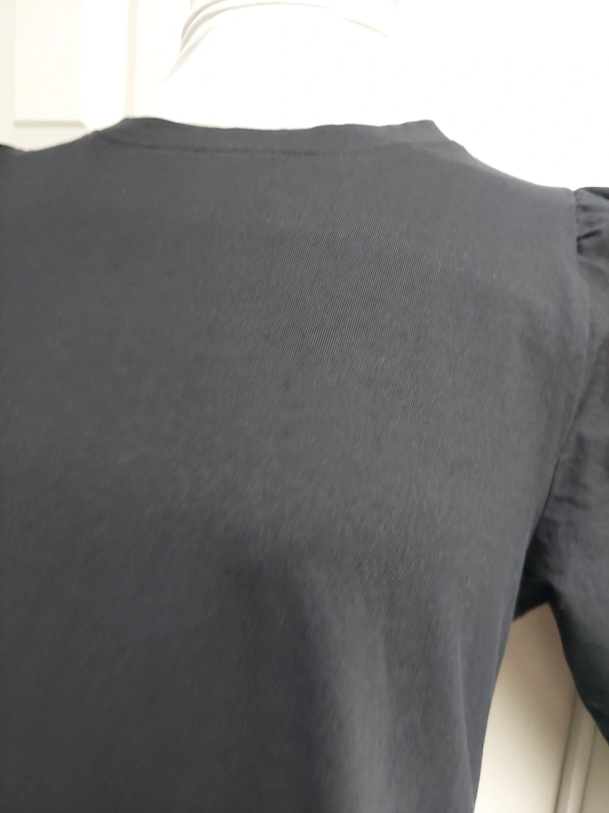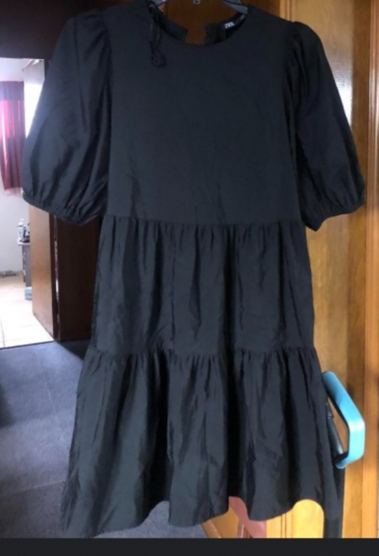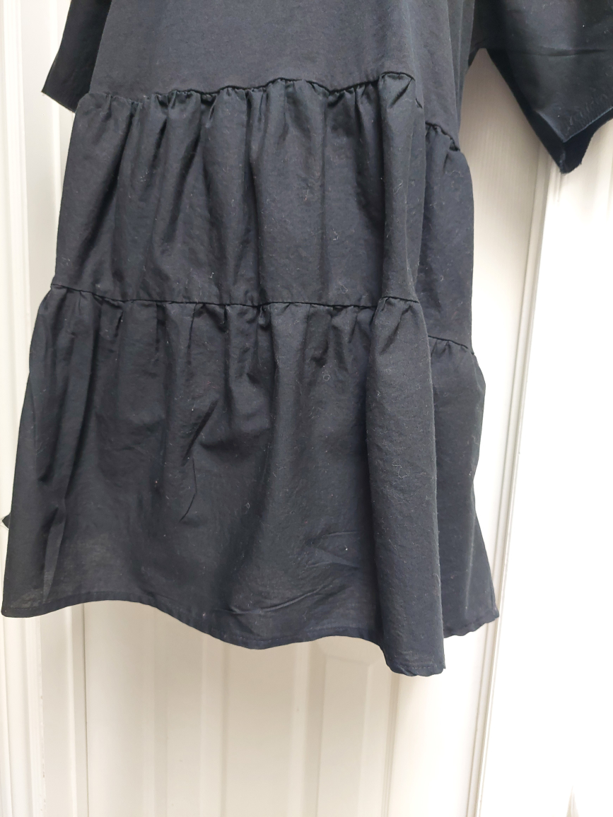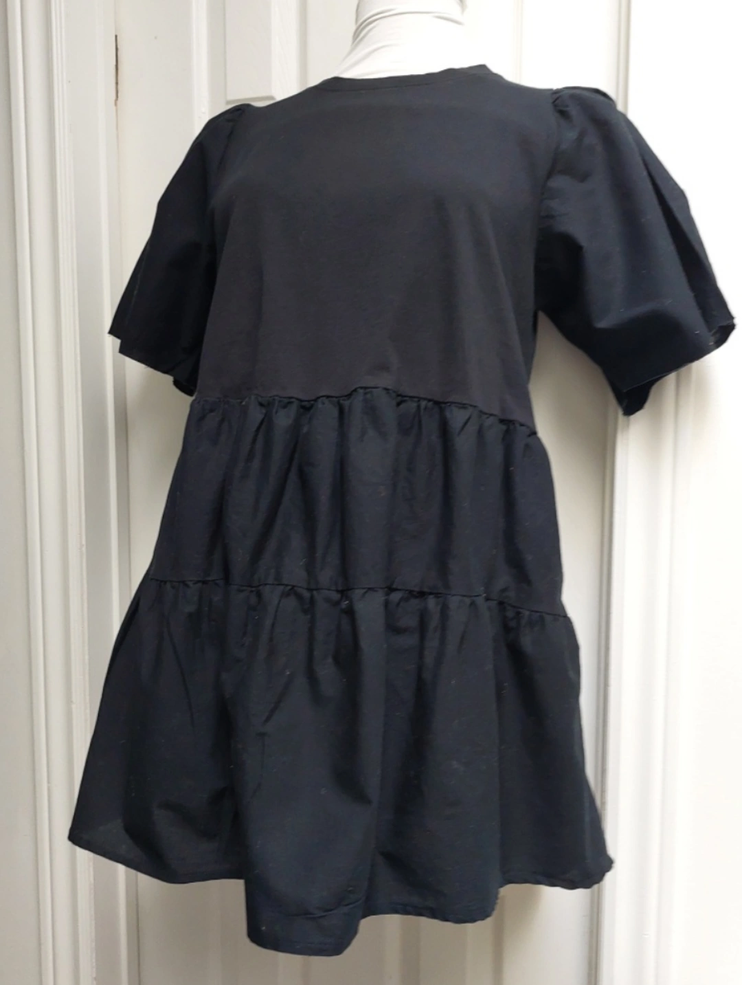 Black mini dress. Tiered skirt. Short puff sleeves. Size large.