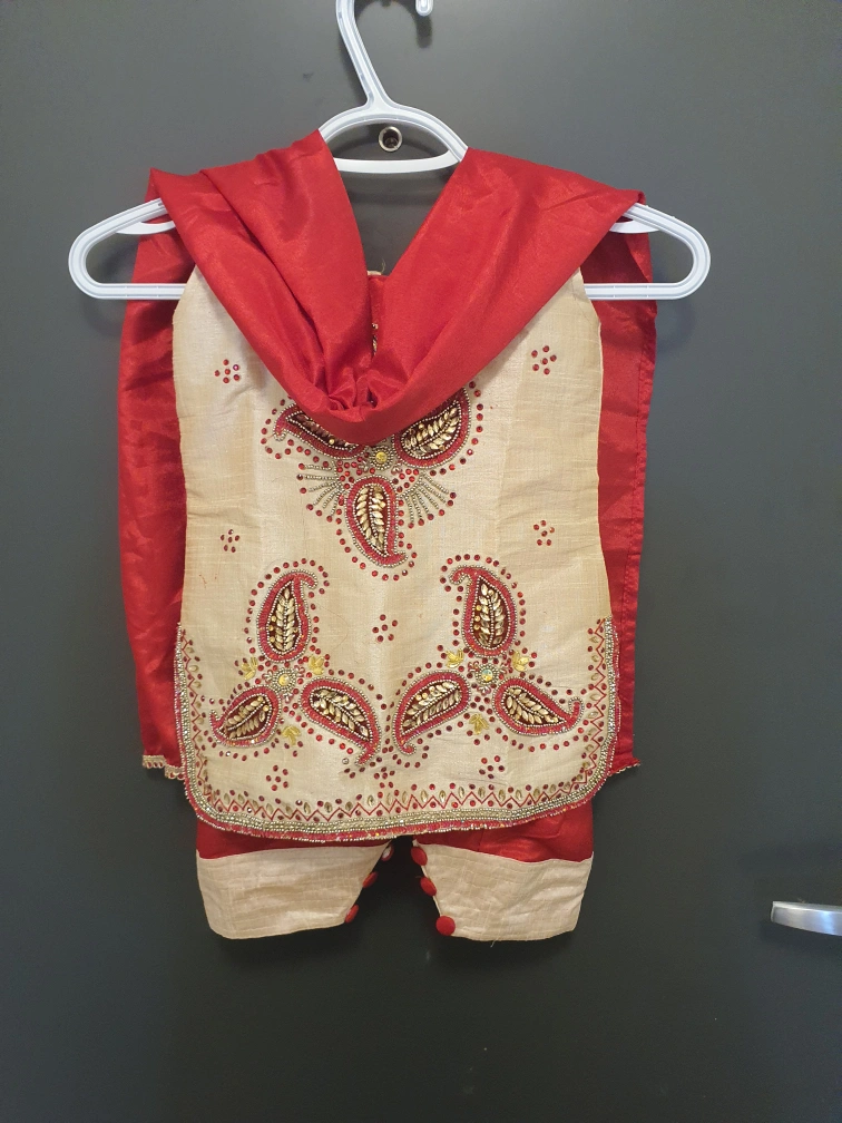 Beautiful girls' salwar kameez. Red and beige colours. Embellished with gold detailing. Includes a dupatta. Suitable for special occasions.