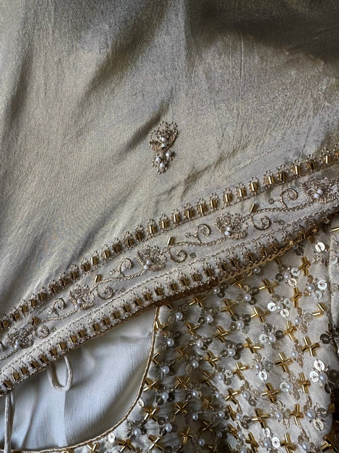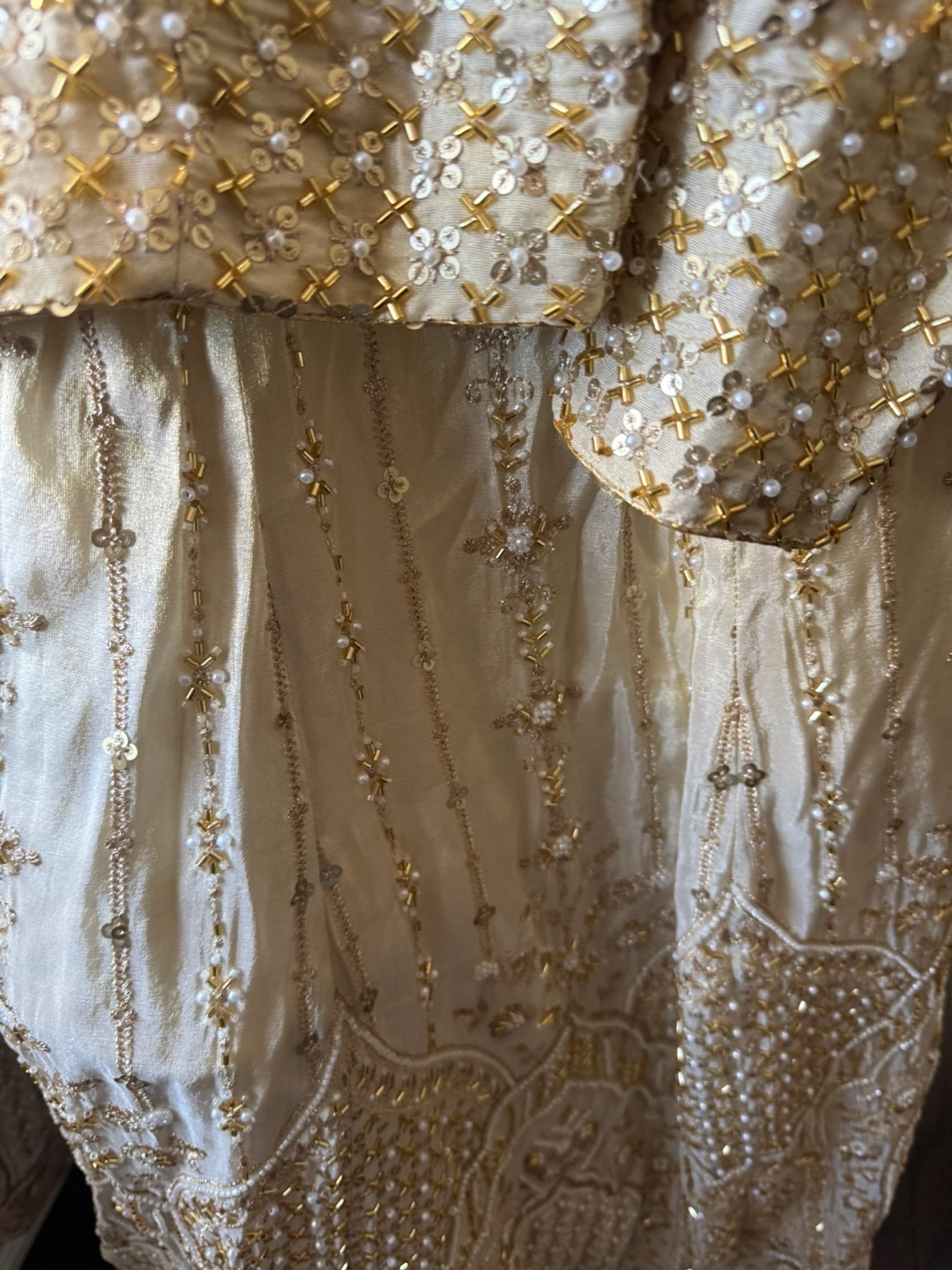 Stunning champagne-coloured lehenga choli. Intricate gold beading and embroidery throughout. Beautiful detailing. Three-quarter sleeves. Perfect for a special occasion.