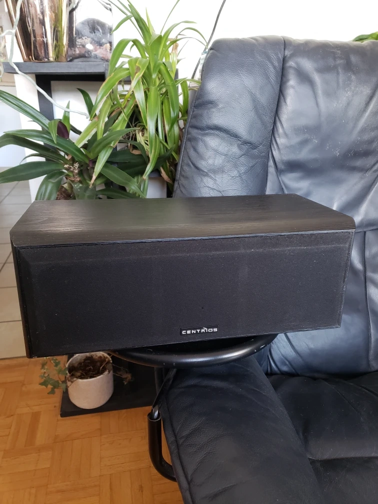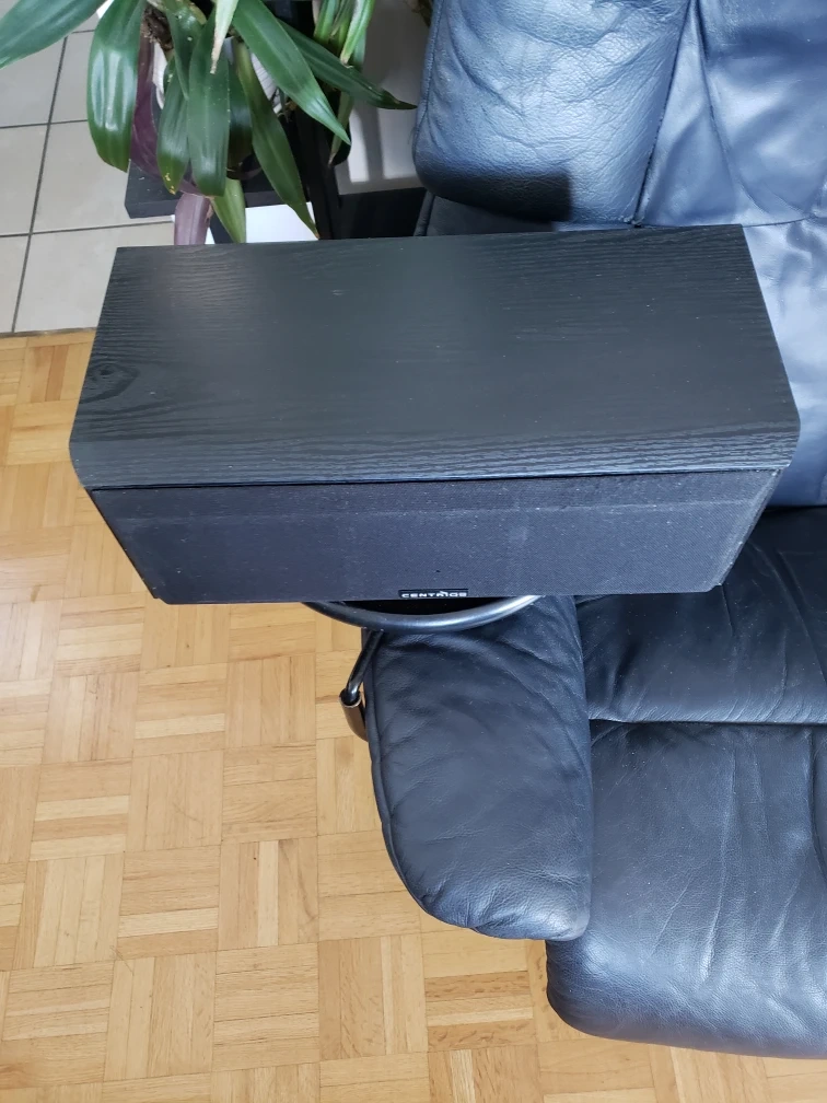 Black home theatre speaker. Good condition. Includes wire. Model number: CS6023. Center speaker.