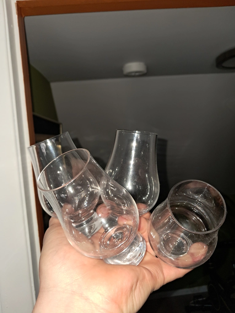 7 clear glasses. Perfect for a little tipple of the good stuff with friends! No chips or cracks. 10$ each