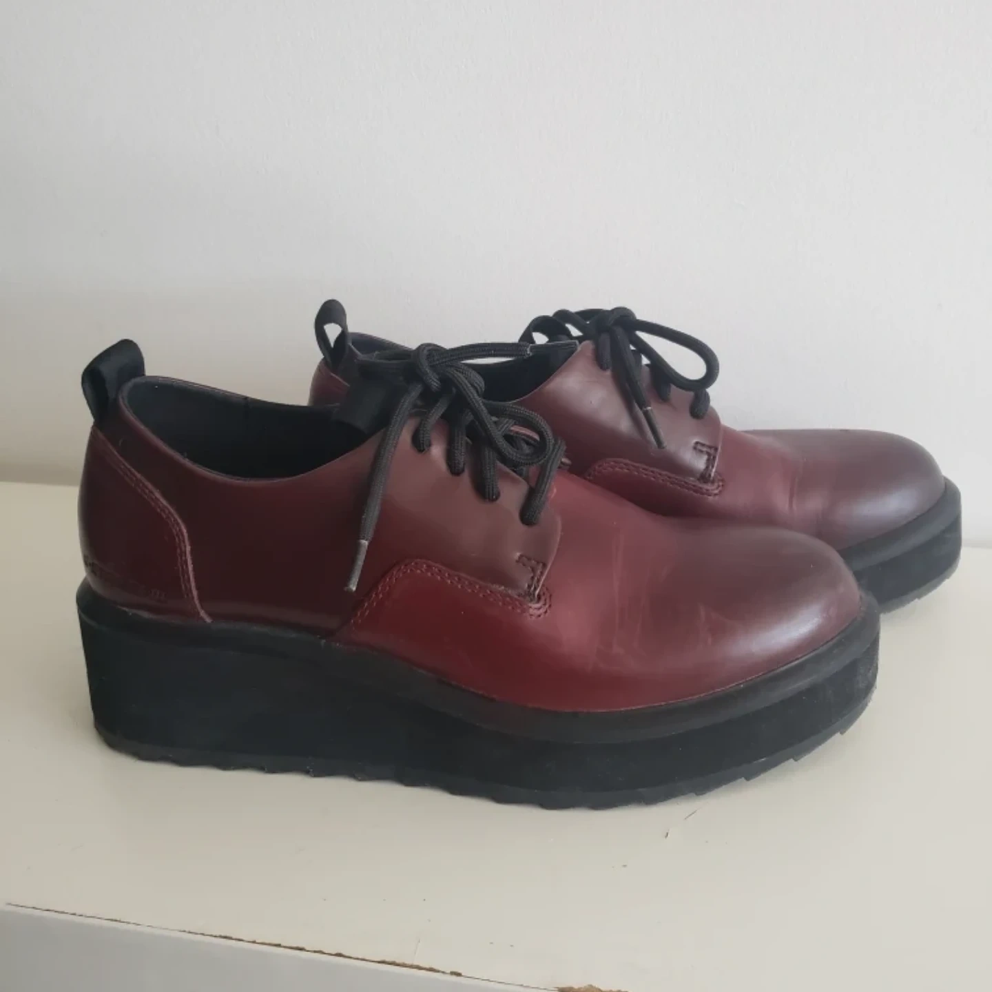 Women's burgundy leather lace-up oxfords. Platform sole. Some visible scuffs.
