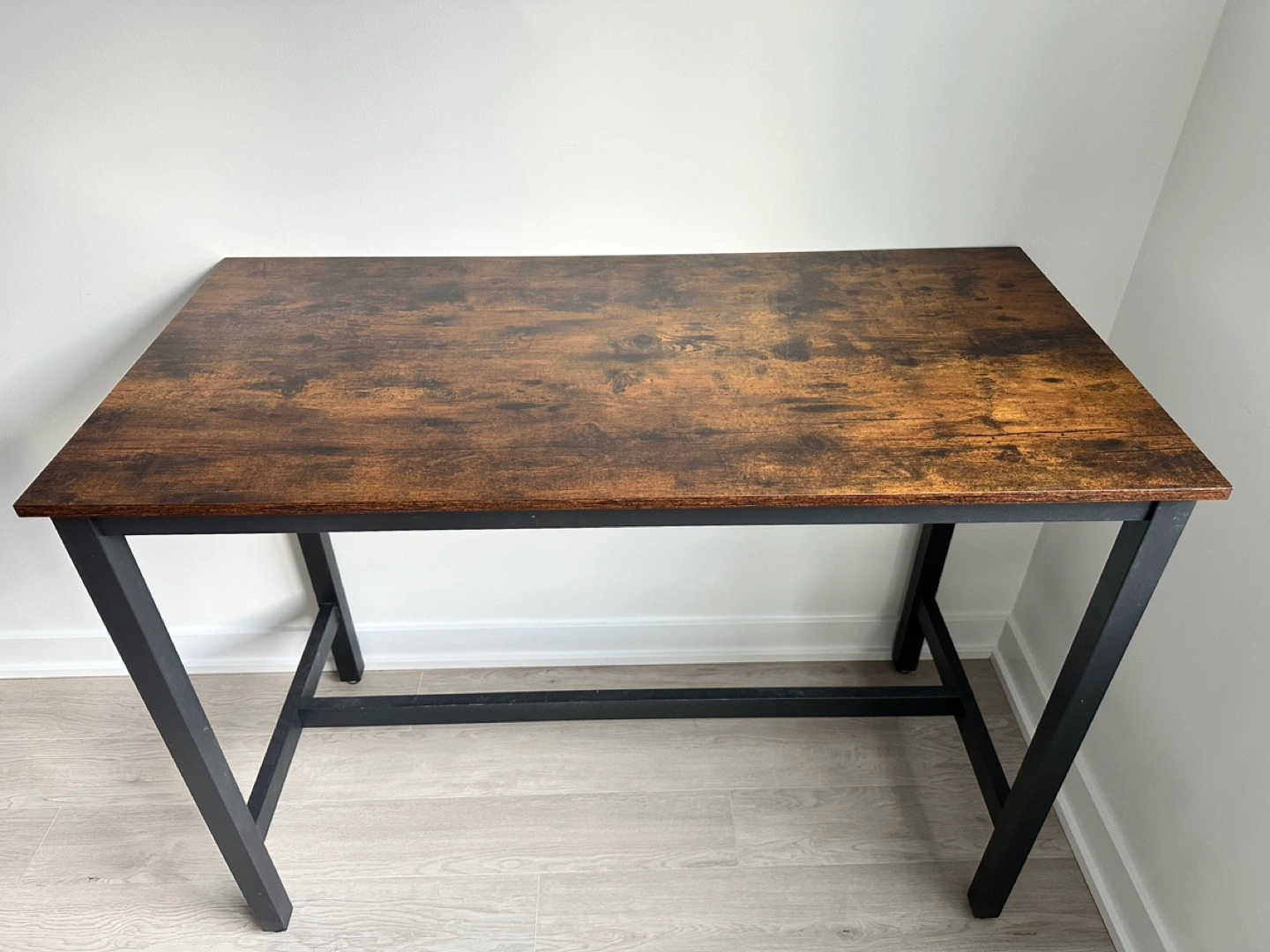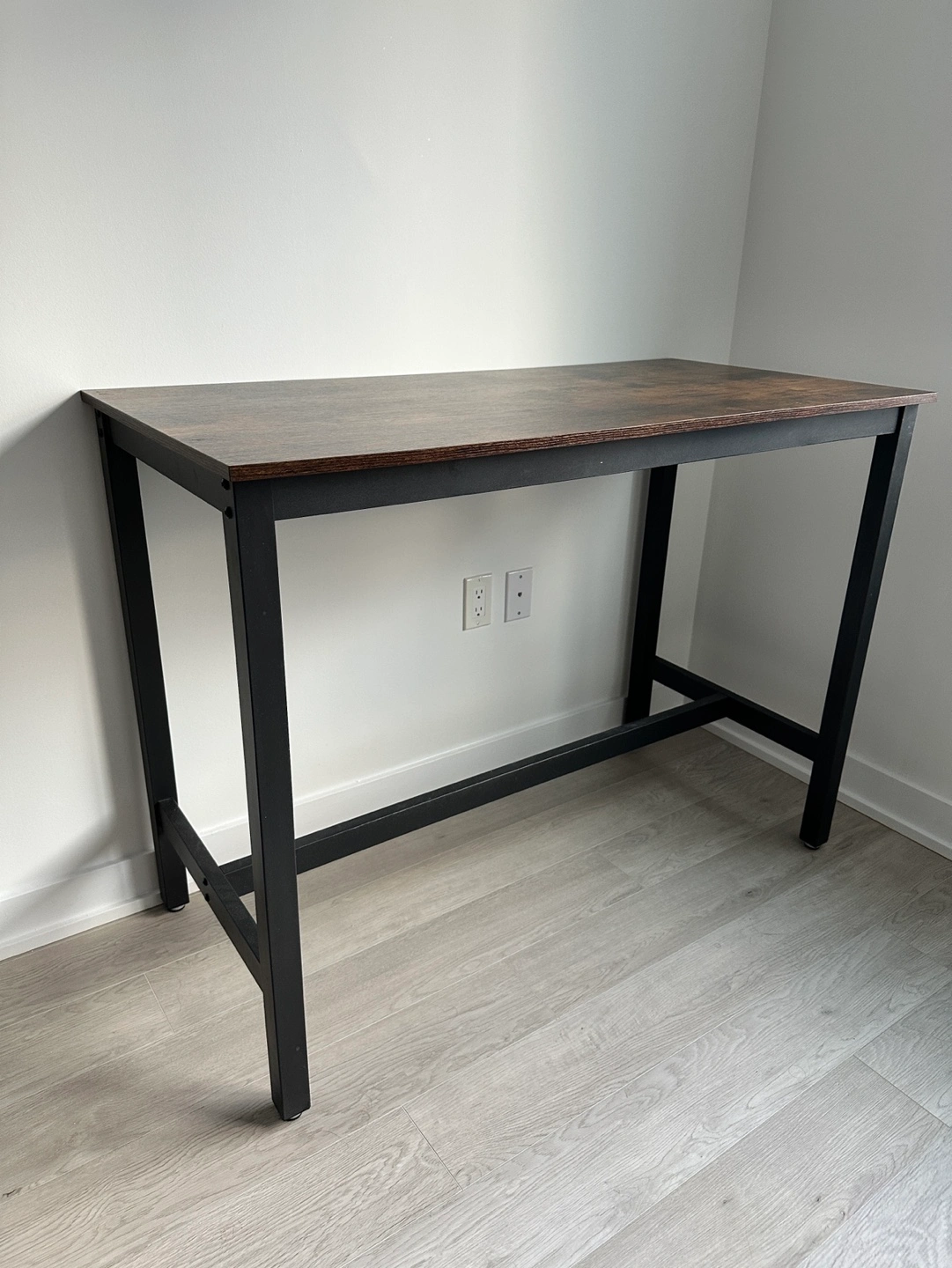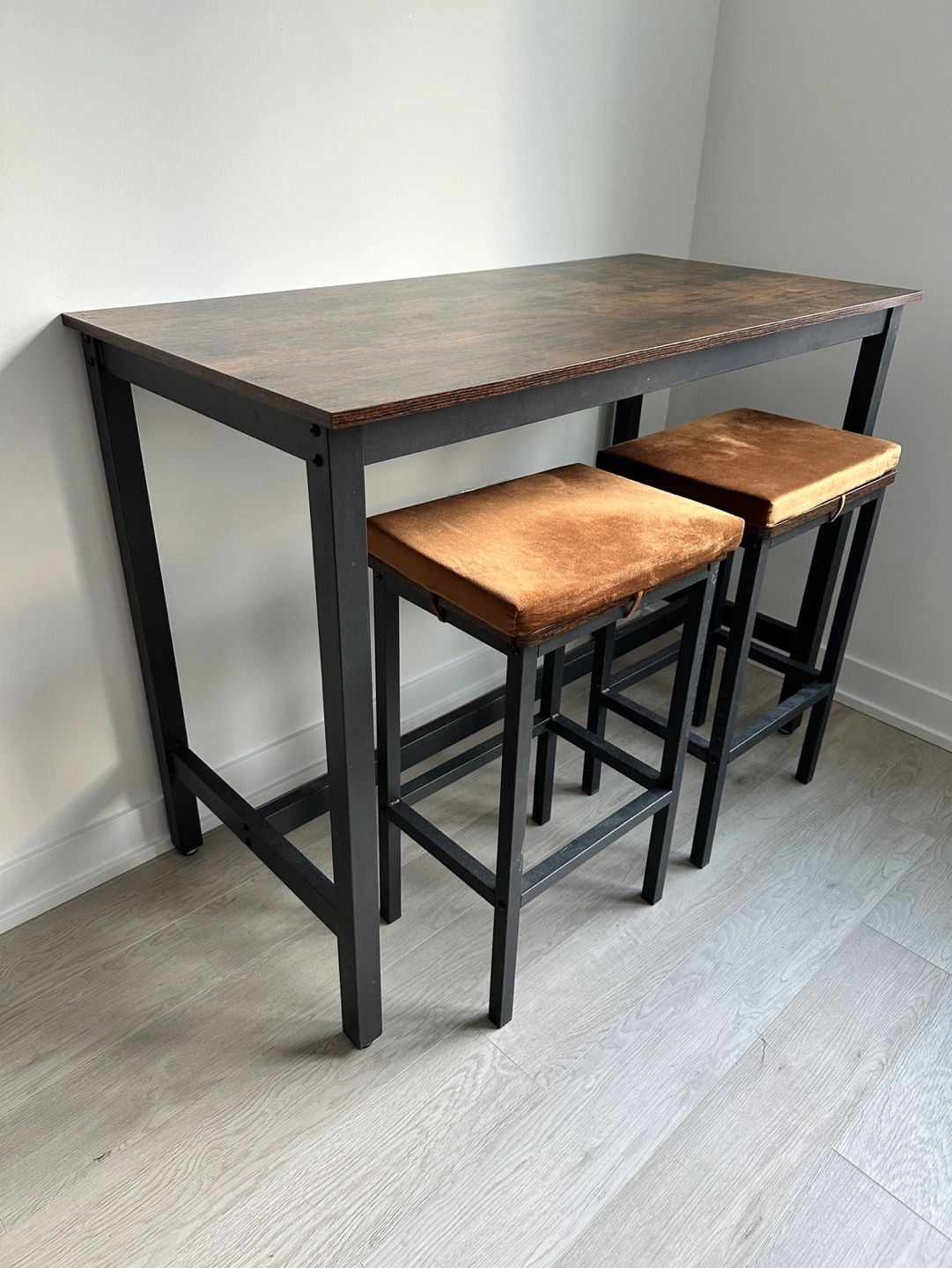 Dark brown wood bar table, black metal frame. Two matching bar stools with customized chair pads. Minimalist and perfect for small homes.