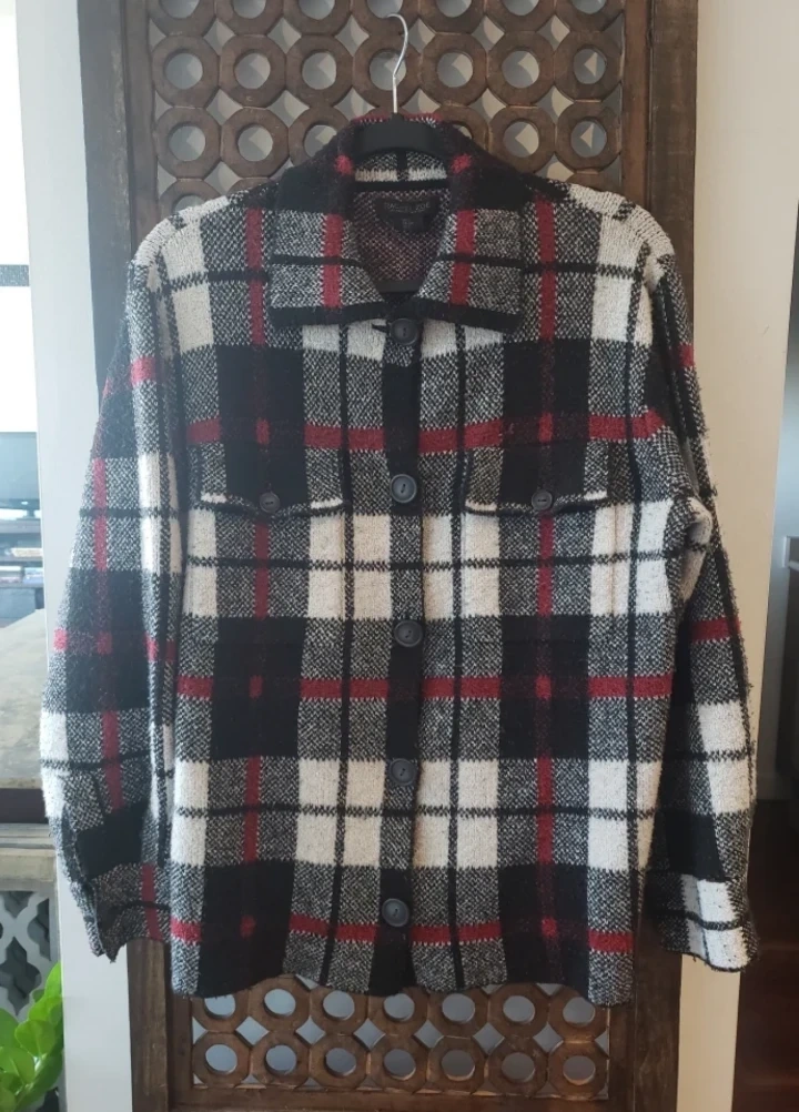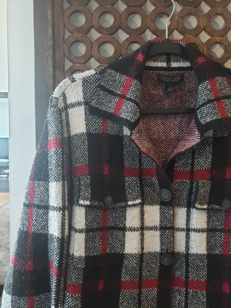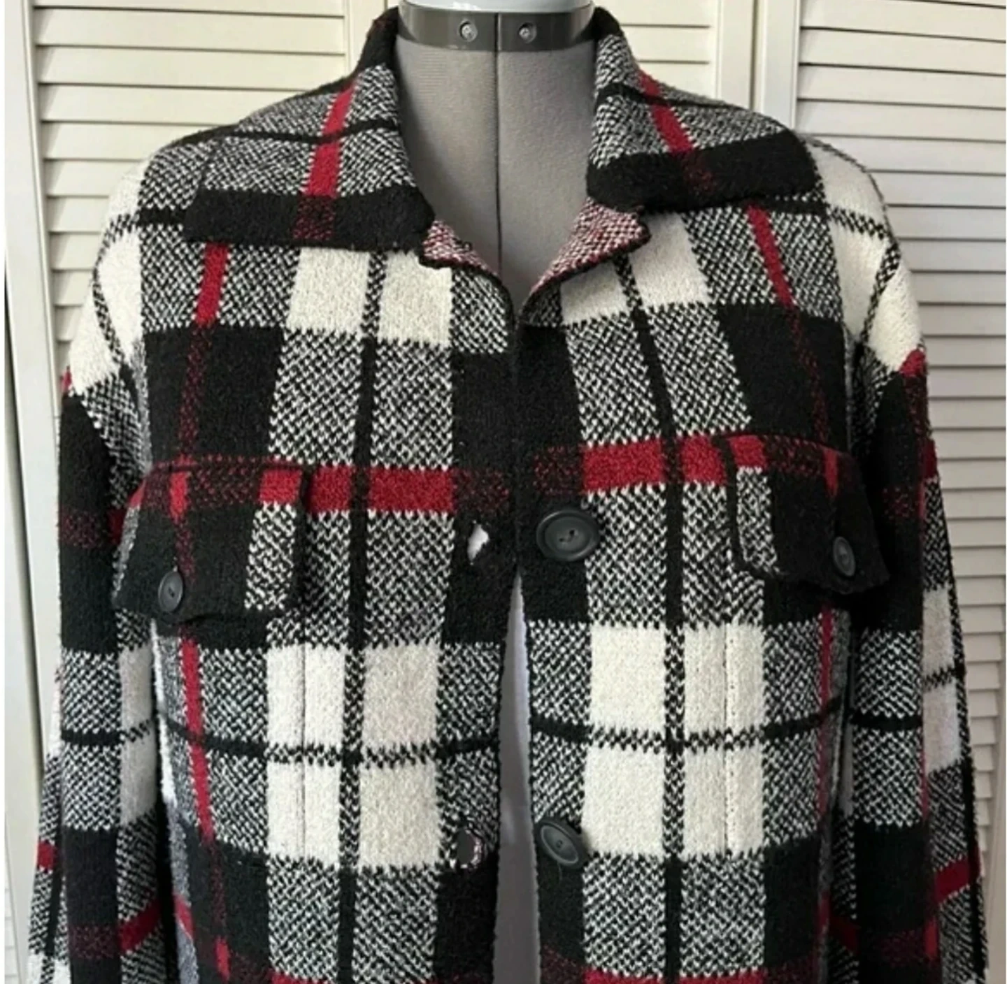 Red, black and white plaid pattern knit jacket/sweater. Button front closure and pocket details. Size small, could also fit a medium.
