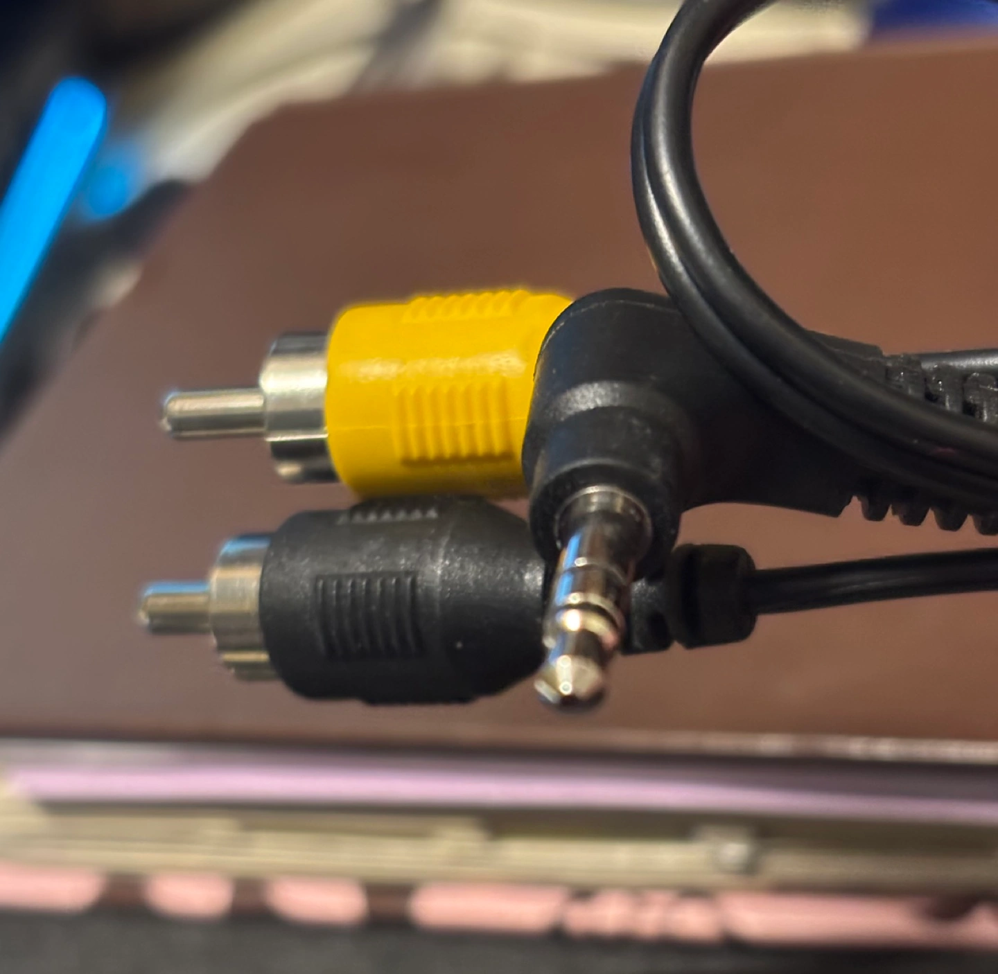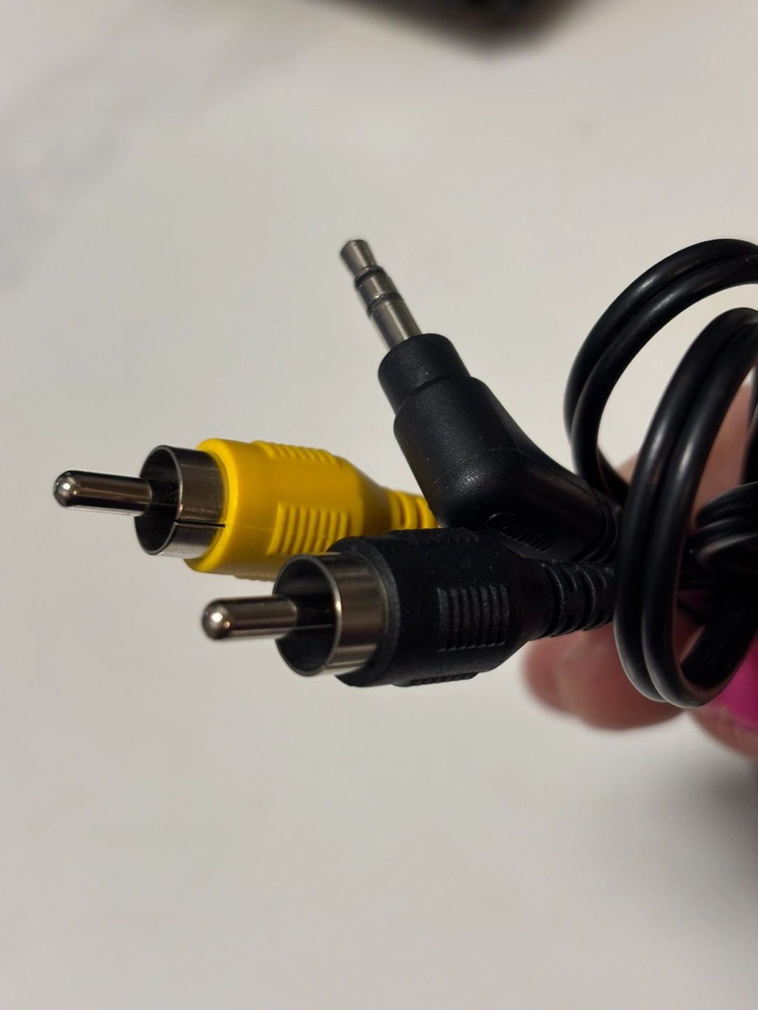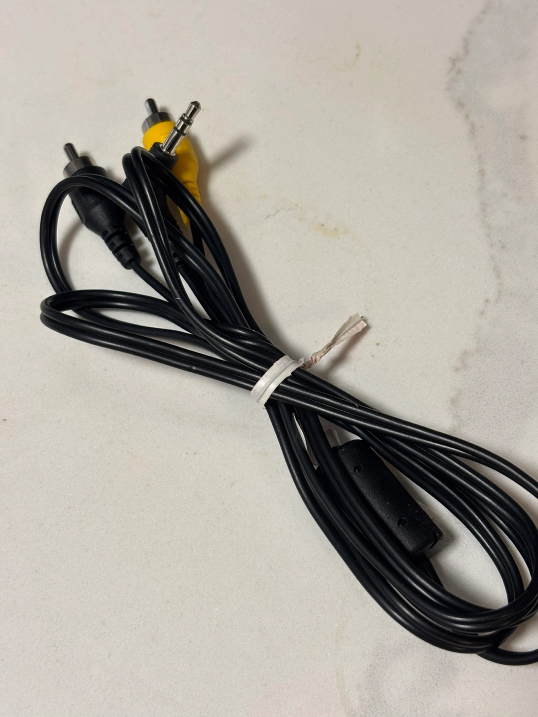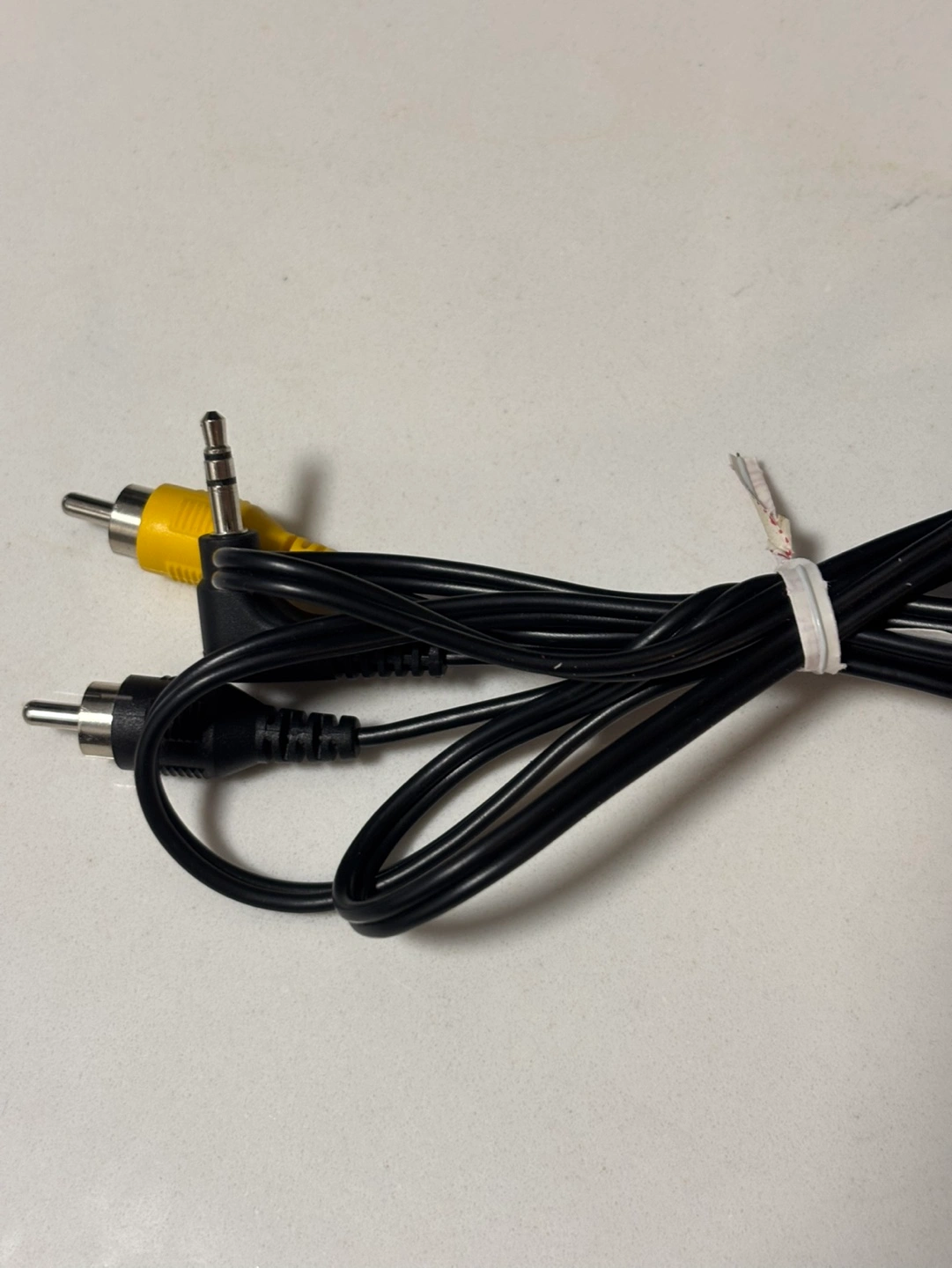 Black AV cable. Features RCA yellow and white connectors and a 3.5mm connector. Good condition.