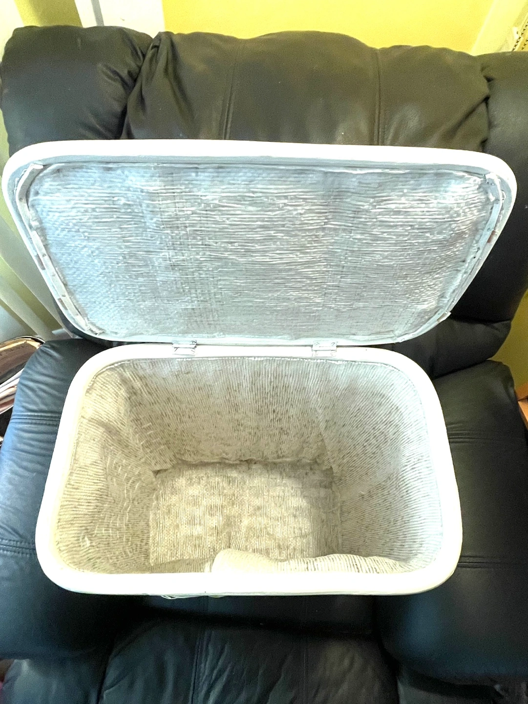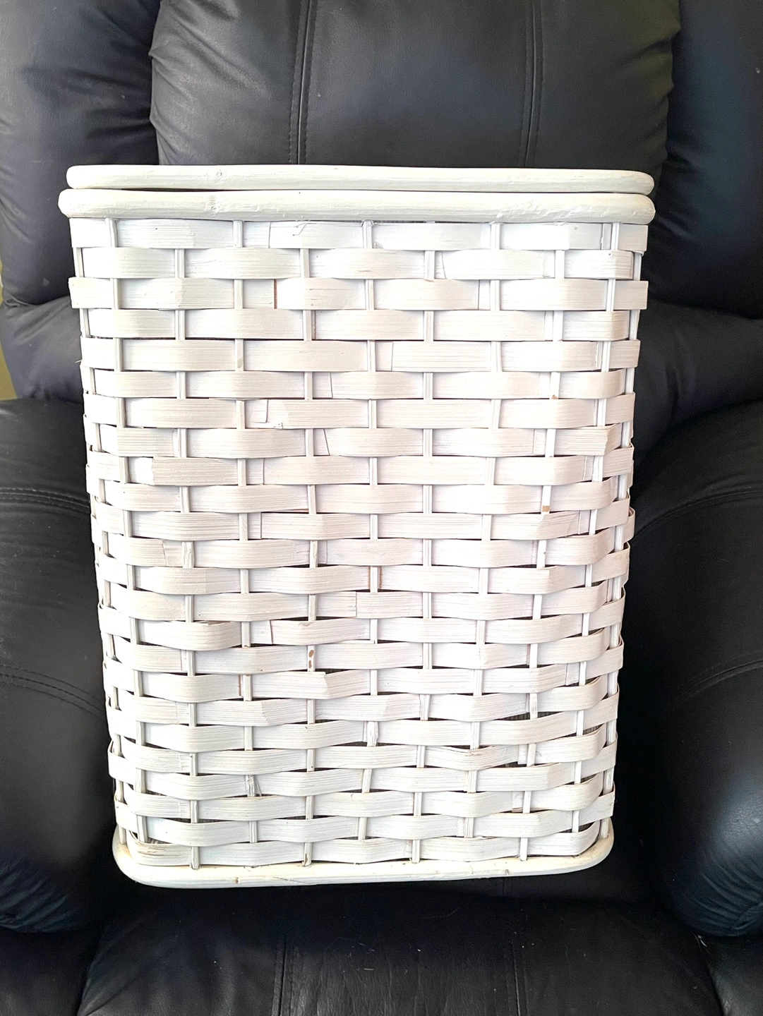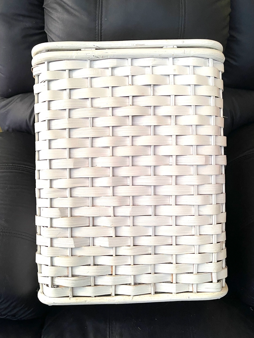 174Vintage white woven wood, lined laundry hamper. Rectangular shape. Great for laundry or storage. Very good condition. Paint could use a touchup here and there.