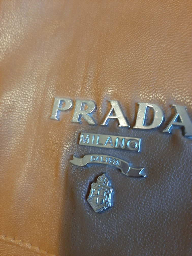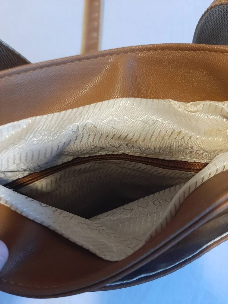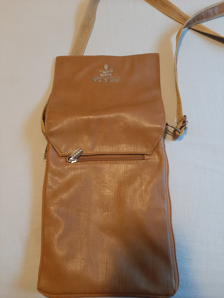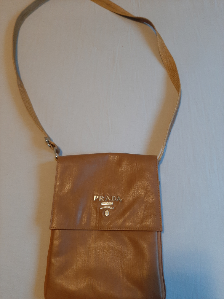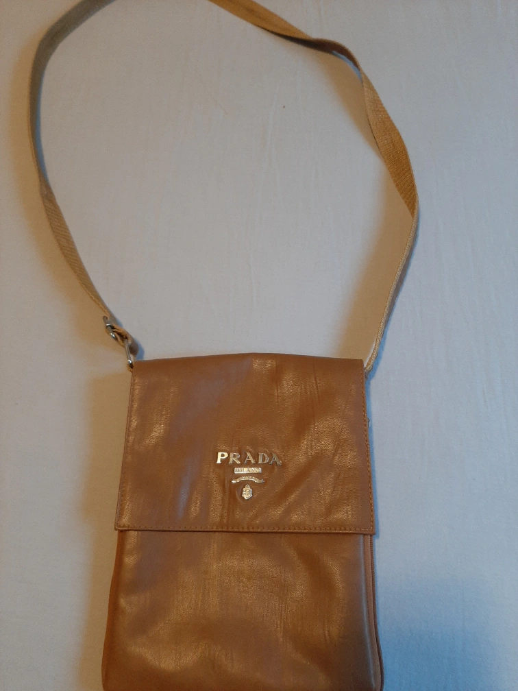 Authentic Prada crossbody bag. Tan leather. Adjustable strap. Small zippered pocket inside. Minimal wear.