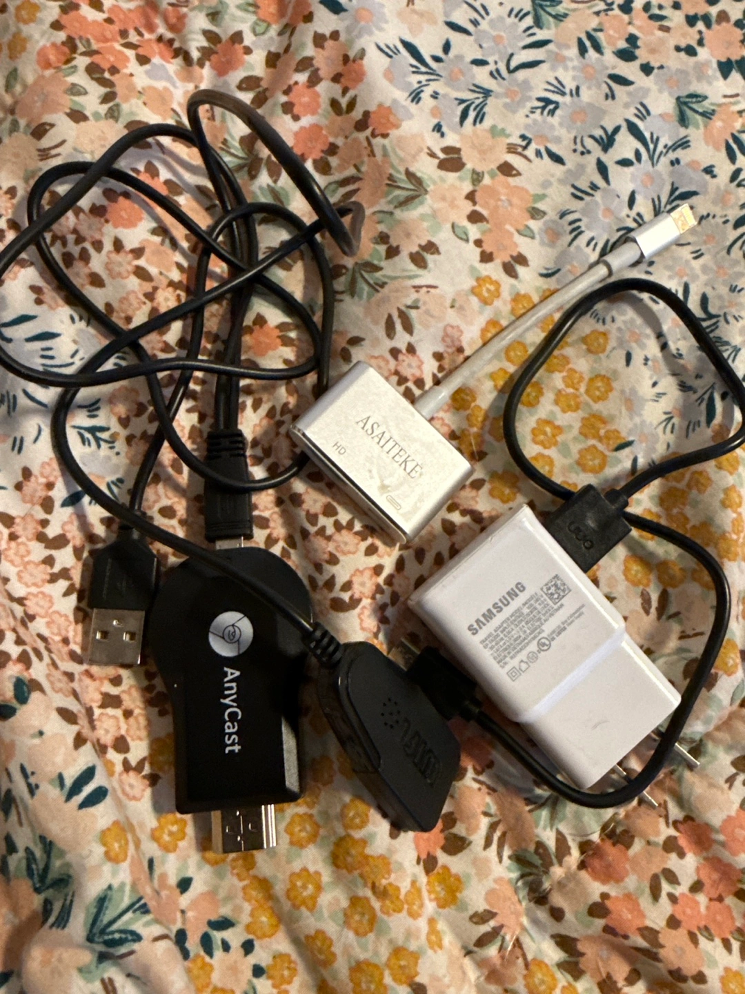 Bundle includes AnyCast HDMI adapter, ASAITEKE HDMI adapter, and Samsung phone charger. Various cables included. Pre-owned.