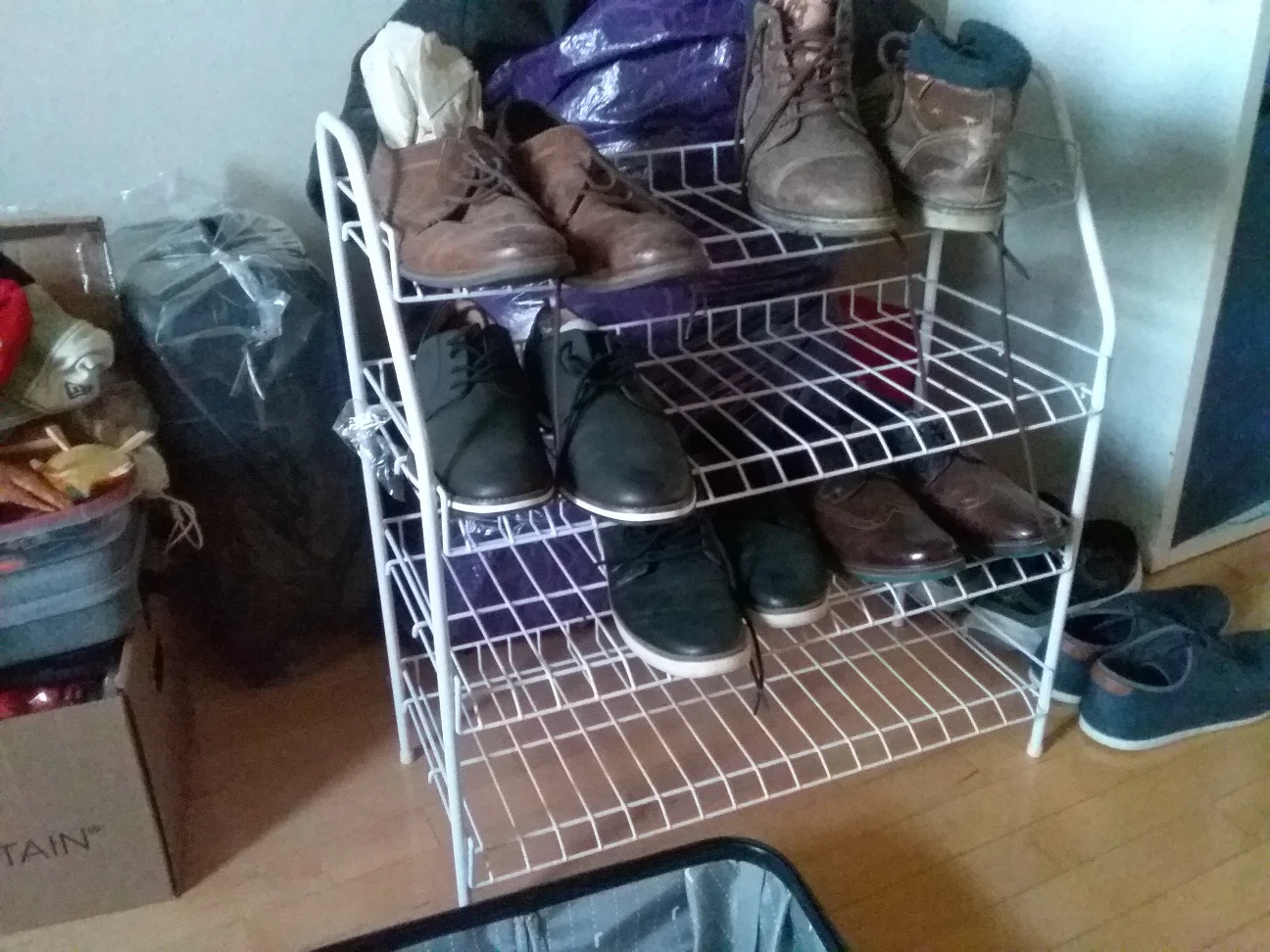 White wire shoe rack, four tiers. Holds several pairs of shoes. Good for organizing footwear. Pickup ASAP